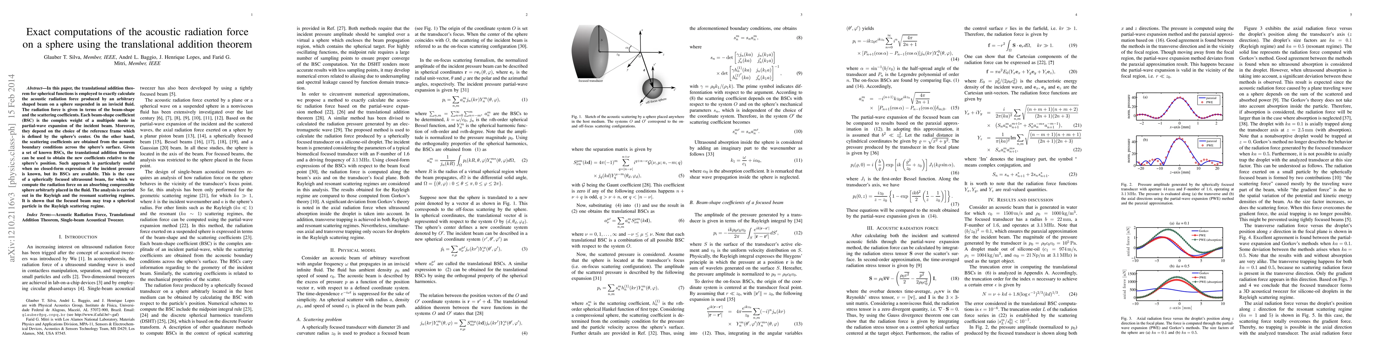 In this paper, the translational addition theorem for spherical functions is employed to exactly calculate the acoustic radiation force produced by an arbitrary shaped beam on a sphere suspended in an inviscid fluid. The radiation force is given in terms of the beam-shape and the scattering coefficients. Each beam-shape coefficient (BSC) is the complex weight of a multipole mode in partial-wave expansion of the incident beam. Moreover, they depend on the choice of the reference frame which is defined by the sphere's center. On the other hand, the scattering coefficients are obtained from the acoustic boundary conditions across the sphere's surface. Given a set of known BSCs, the translational addition theorem can be used to obtain the new coefficients relative to the sphere's position. Such approach is particularly useful when no closed-form expression of the incident pressure is known, but its BSCs are available. This is the case of a spherically focused ultrasound beam, for which we compute the radiation force on an absorbing compressible sphere arbitrarly placed in the fluid. The analysis is carried out in the Rayleigh and the resonant scattering regimes. It is shown that the focused beam may trap a spherical particle in the Rayleigh scattering regime.