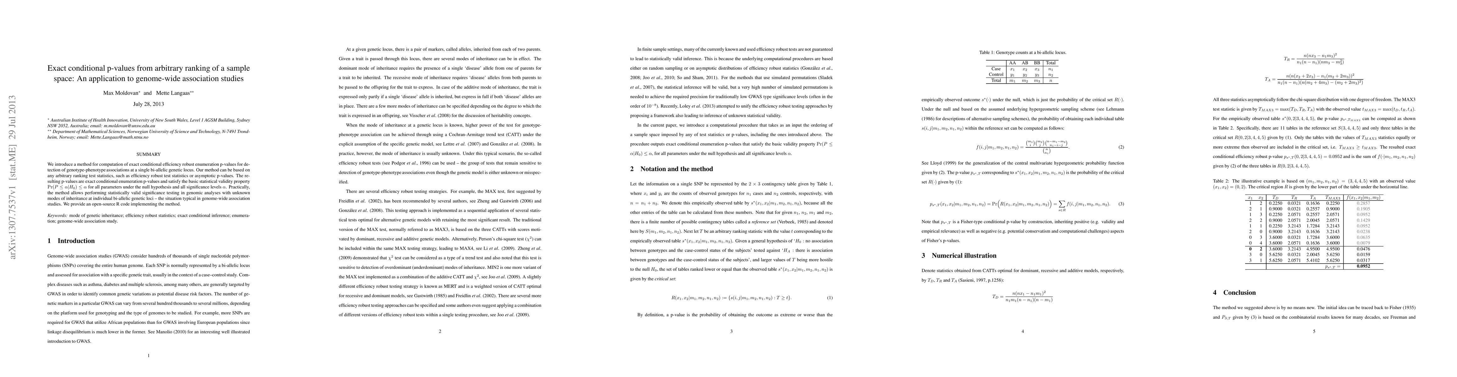 This paper presents a novel method for computing exact conditional p-values for genotype-phenotype association tests at bi-allelic genetic loci, applicable to any ranking test statistics. The method enables statistically valid significance testing in genome-wide association studies where inheritance modes are unknown.