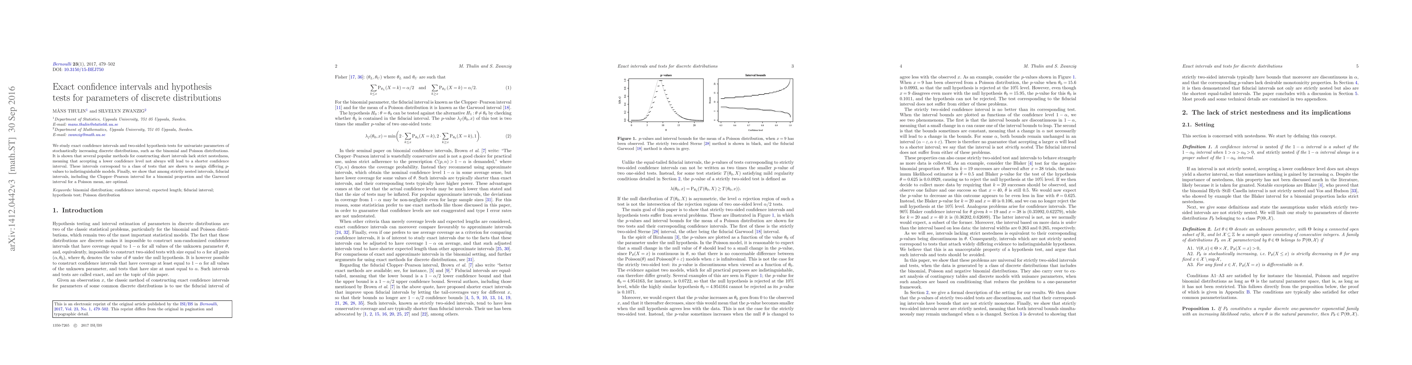 The paper provides a detailed analysis of exact confidence intervals and hypothesis tests, identifying conditions for strict nestedness and optimality, and demonstrating the non-monotonic behavior of certain interval bounds.