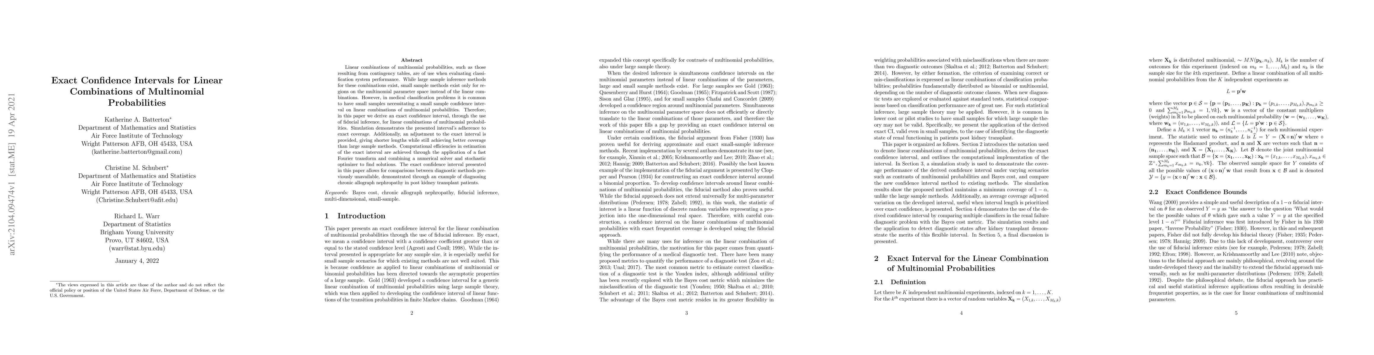 This paper presents an exact confidence interval for linear combinations of multinomial probabilities using fiducial inference, addressing the need for small sample methods in medical classification. The proposed interval, enhanced with a computational adjustment, achieves better coverage than large sample methods and is demonstrated through an application in diagnosing chronic allograph nephropathy.