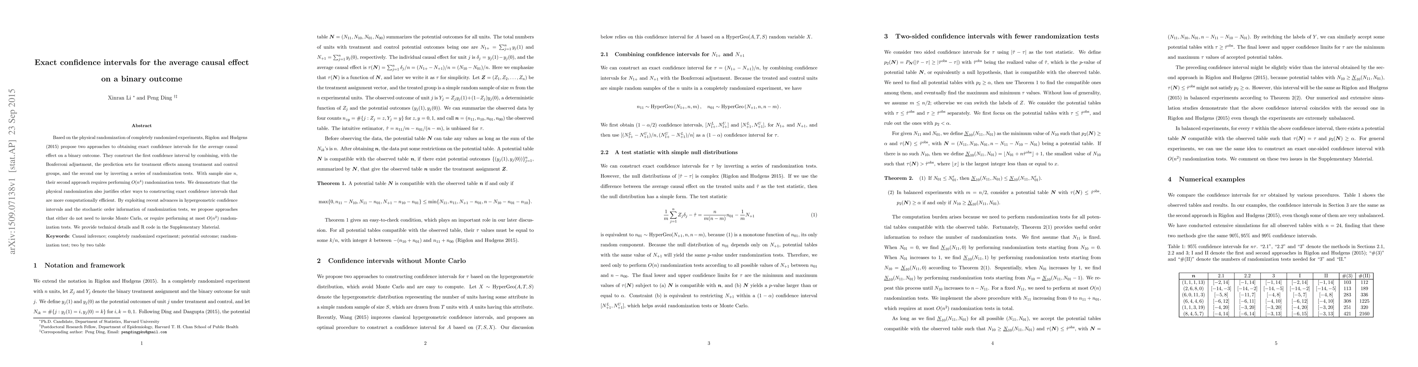This paper proposes more computationally efficient methods for constructing exact confidence intervals for the average causal effect on a binary outcome compared to previous approaches by Rigdon and Hudgens (2015). It leverages recent advances in hypergeometric intervals and randomization tests to achieve better performance with at most $O(n^2)$ tests instead of the original $O(n^4)$.