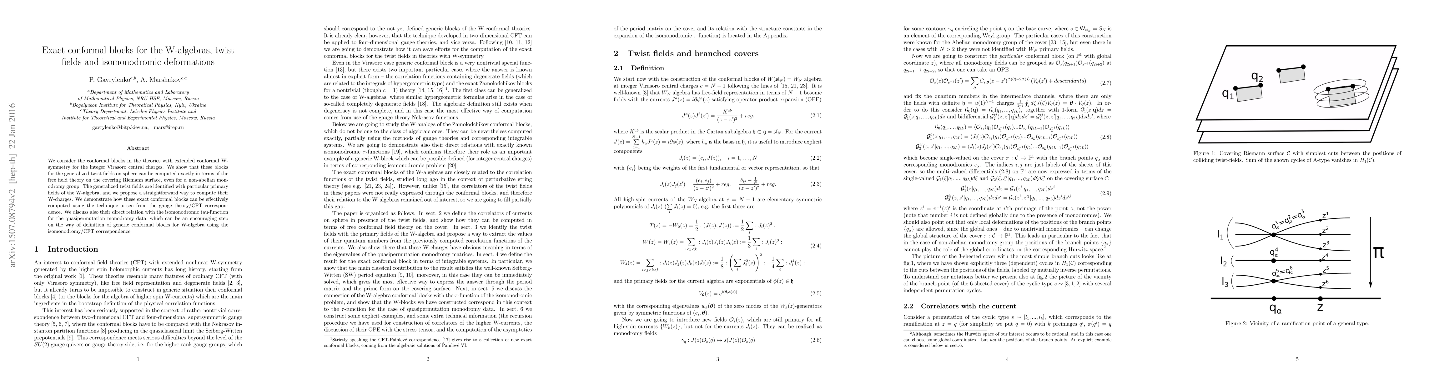 This paper presents an exact method for computing conformal blocks associated with generalized twist fields in theories with extended W-symmetry. It utilizes free field theory on Riemann surfaces and the gauge theory/CFT correspondence, demonstrating a direct link to isomonodromic tau-functions for quasipermutation monodromy data.