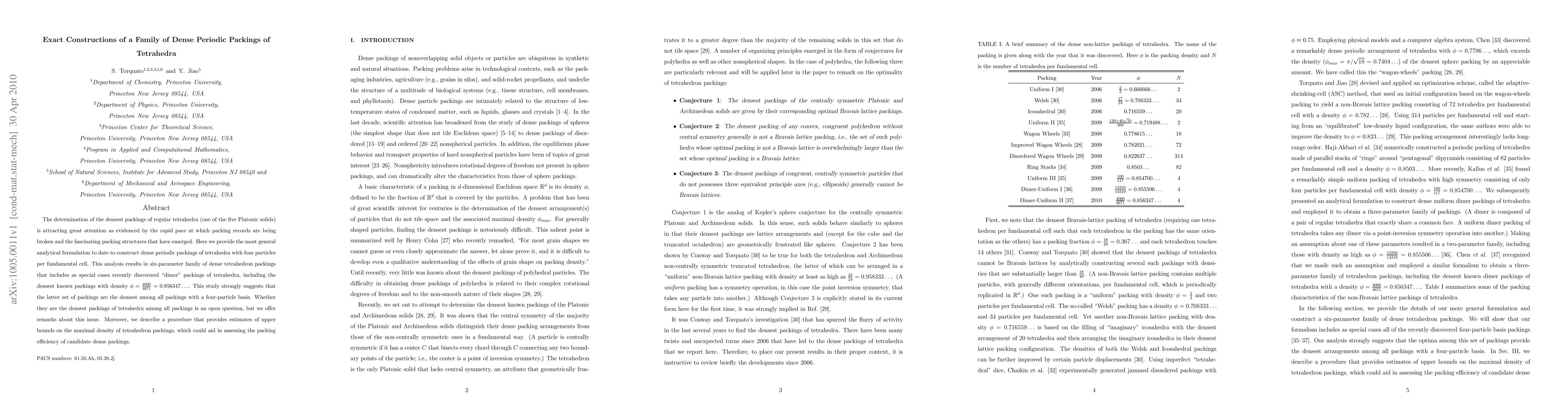 This paper presents an analytical method to construct dense periodic packings of regular tetrahedra, resulting in a six-parameter family that includes the recently discovered "dimer" packings, which currently hold the record for the densest packing with a four-particle basis. The study also outlines a procedure for estimating the maximal density of tetrahedron packings.