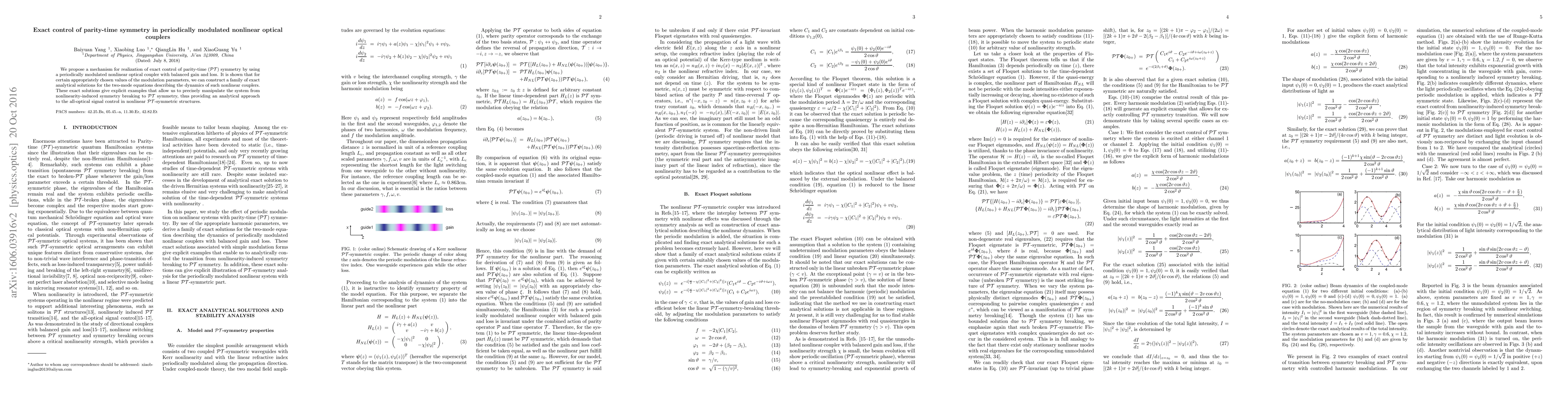 This paper proposes a method for controlling parity-time symmetry in nonlinear optical couplers through periodic modulation, achieving exact analytical solutions that enable precise manipulation from symmetry breaking to PT symmetry. This approach offers an analytical framework for all-optical signal control in nonlinear PT-symmetric structures.