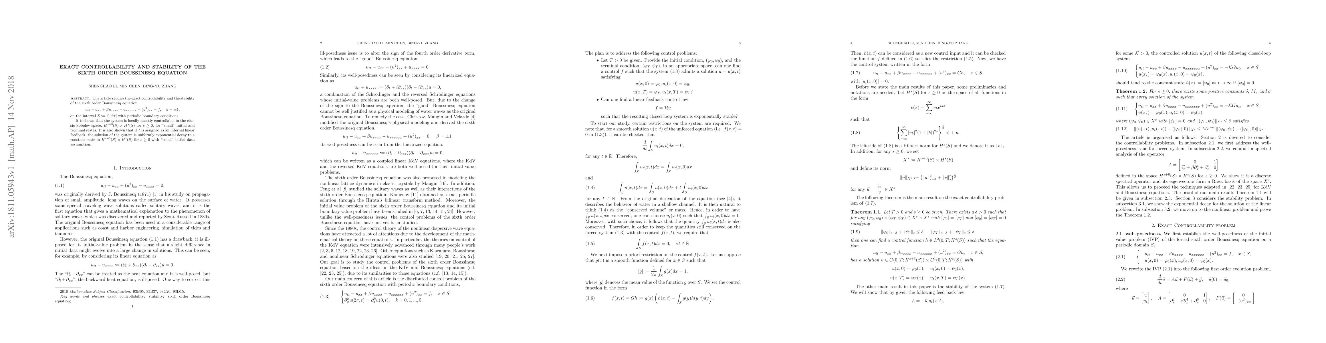 The article studies the exact controllability and the stability of the sixth order Boussinesq equation \[ u_{tt}-u_{xx}+\beta u_{xxxx}-u_{xxxxxx}+(u^2)_{xx}=f, \quad \beta=\pm1, \] on the interval $S:=[0,2\pi]$ with periodic boundary conditions. It is shown that the system is locally exactly controllable in the classic Sobolev space, $H^{s+3}(S)\times H^s(S)$ for $s\geq 0$, for "small" initial and terminal states. It is also shown that if $f$ is assigned as an internal linear feedback, the solution of the system is uniformly exponential decay to a constant state in $H^{s+3}(S)\times H^s(S)$ for $s\geq 0$ with "small" initial data assumption.