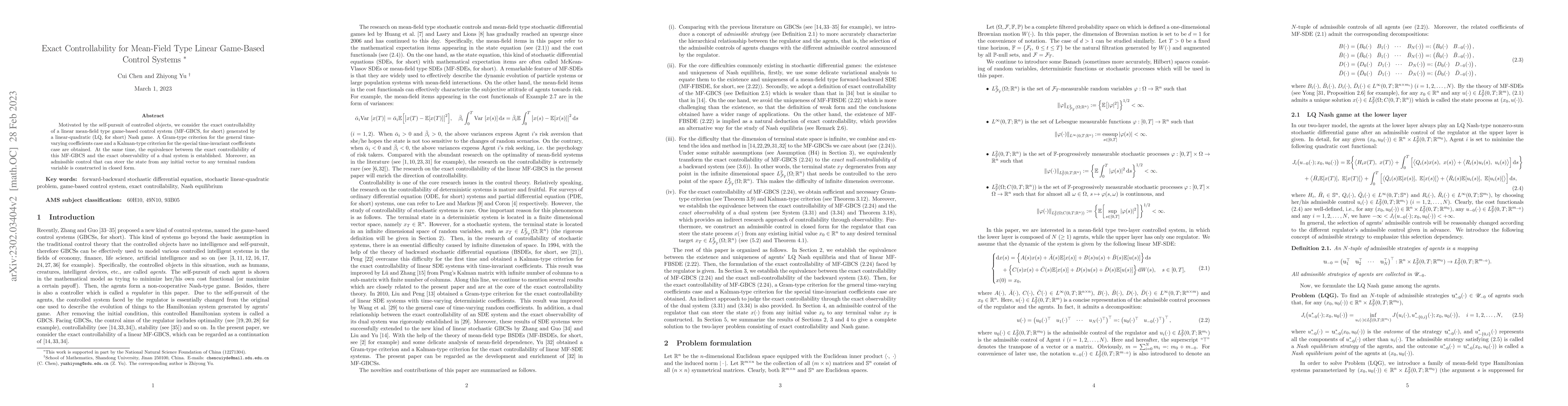 Motivated by the self-pursuit of controlled objects, we consider the exact controllability of a linear mean-field type game-based control system (MF-GBCS, for short) generated by a linear-quadratic (LQ, for short) Nash game. A Gram-type criterion for the general timevarying coefficients case and a Kalman-type criterion for the special time-invariant coefficients case are obtained. At the same time, the equivalence between the exact controllability of this MF-GBCS and the exact observability of a dual system is established. Moreover, an admissible control that can steer the state from any initial vector to any terminal random variable is constructed in closed form.