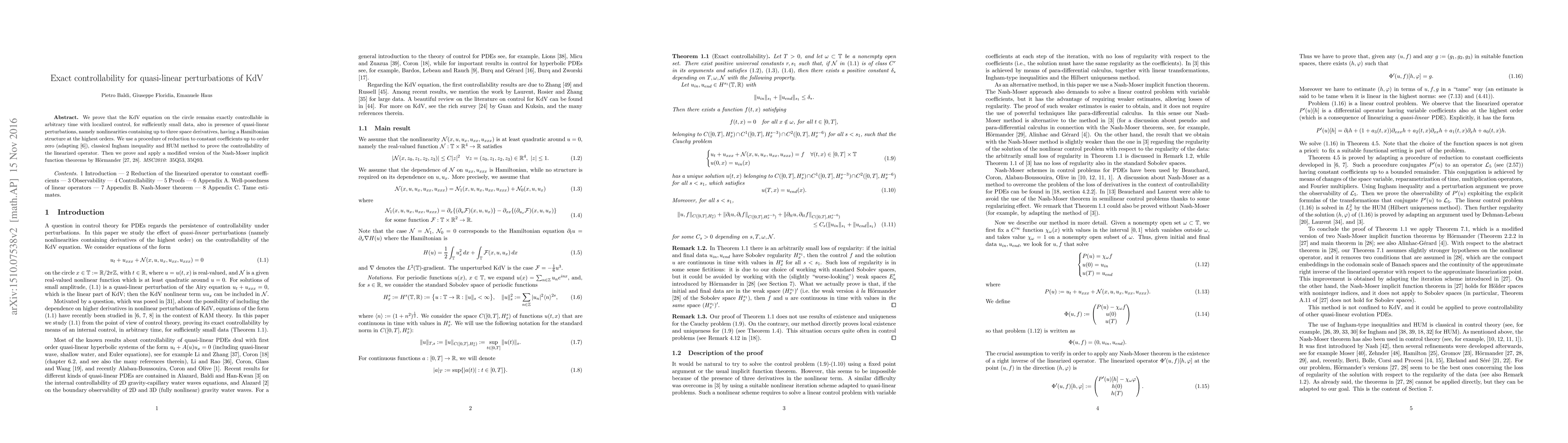 The KdV equation on a circle is exactly controllable with localized control for small data, even with quasi-linear perturbations containing up to three space derivatives.
