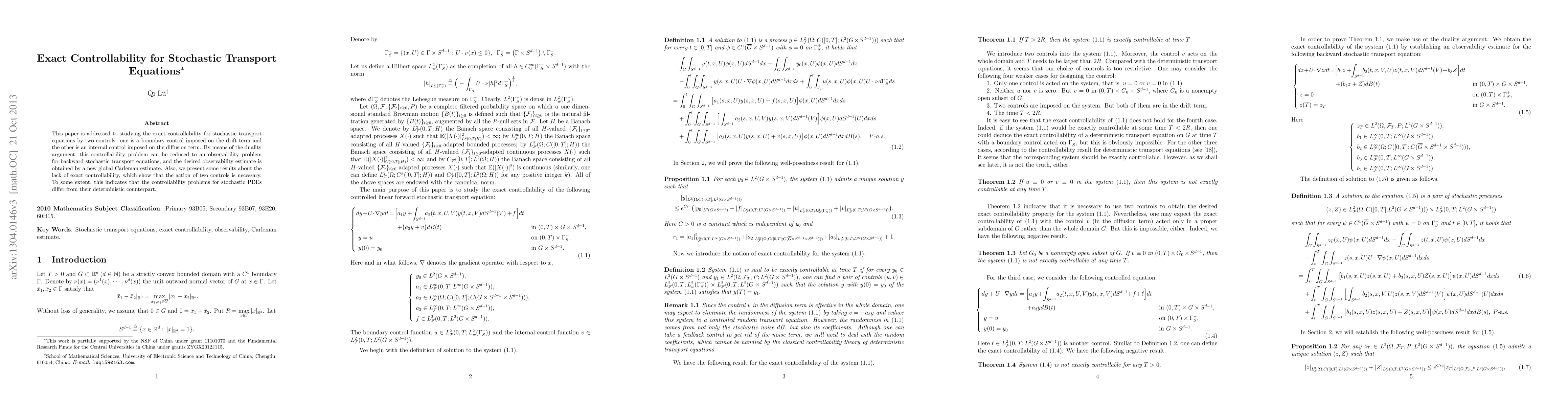 This paper investigates exact controllability for stochastic transport equations using two types of controls, demonstrating that both boundary and internal controls are essential. A new global Carleman estimate is employed to establish observability, highlighting differences between stochastic and deterministic controllability.