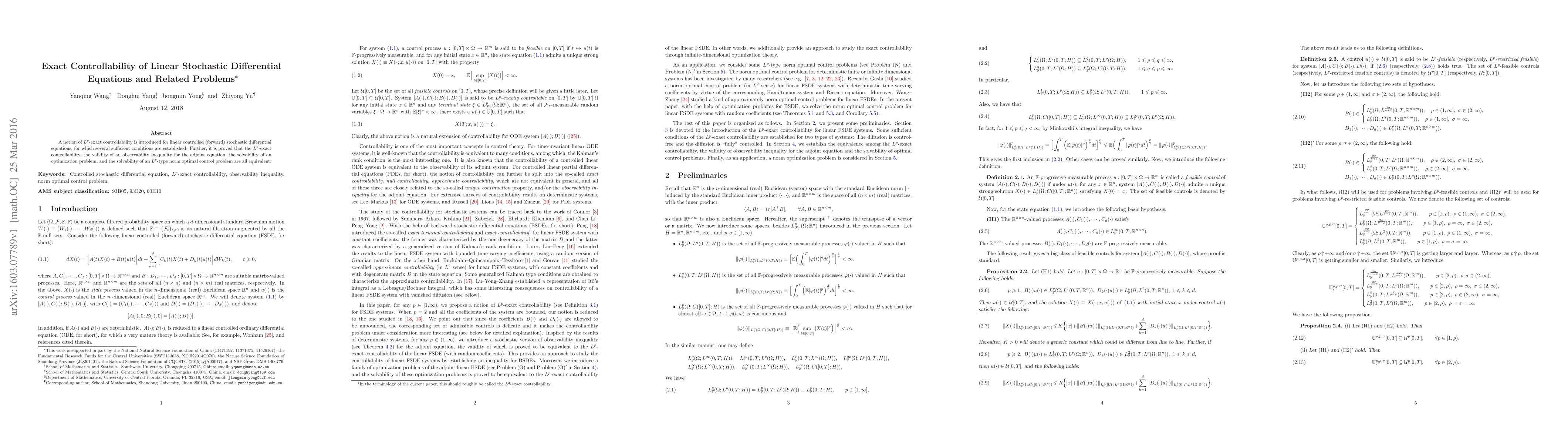 A notion of $L^p$-exact controllability is introduced for linear controlled (forward) stochastic differential equations, for which several sufficient conditions are established. Further, it is proved that the $L^p$-exact controllability, the validity of an observability inequality for the adjoint equation, the solvability of an optimization problem, and the solvability of an $L^p$-type norm optimal control problem are all equivalent.