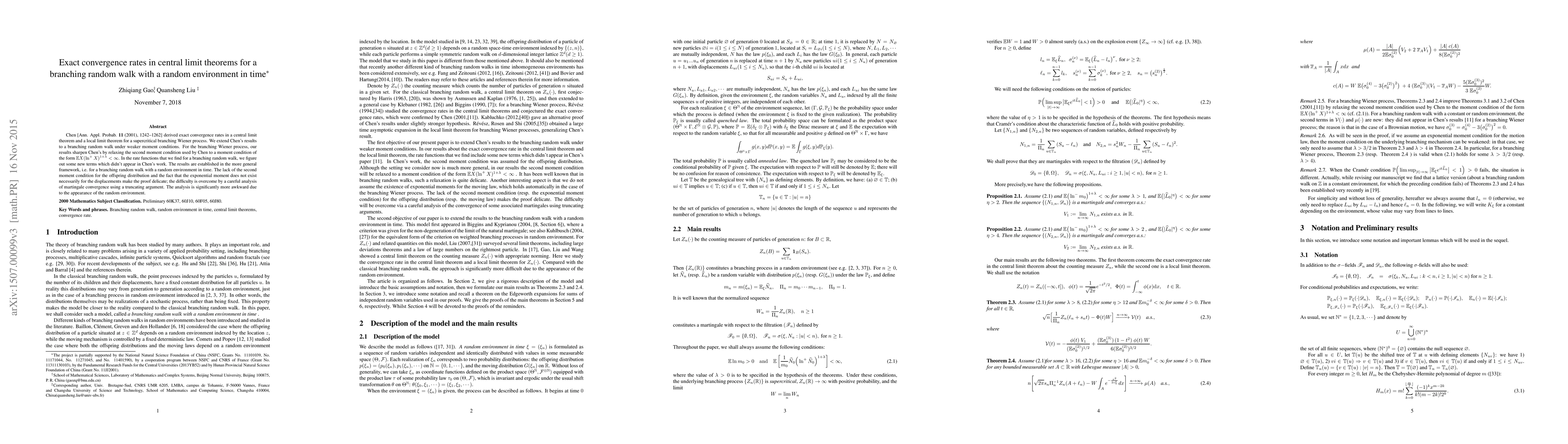 This paper extends Chen's results on exact convergence rates in central limit theorems for a supercritical branching Wiener process to a branching random walk under weaker moment conditions. The authors introduce new terms and relax the second moment condition, achieving sharper results with a more general framework that includes a random environment in time.