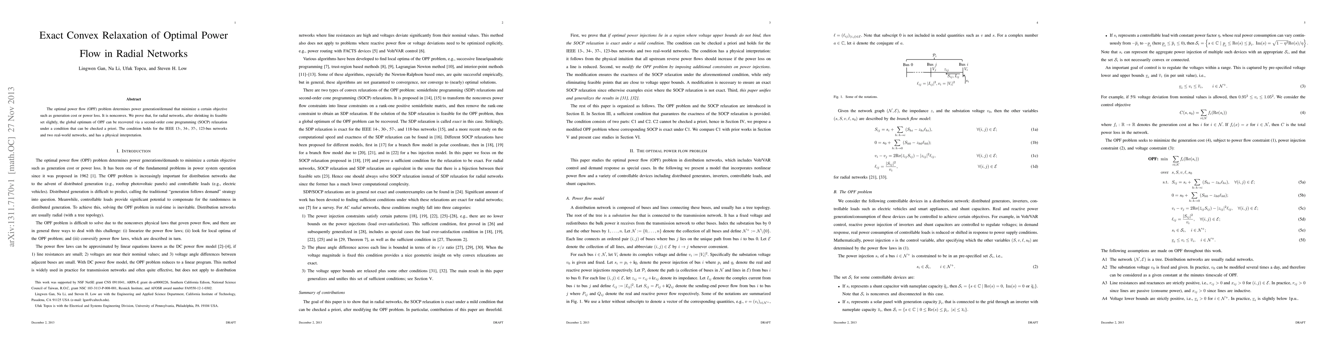 The optimal power flow (OPF) problem determines power generation/demand that minimize a certain objective such as generation cost or power loss. It is nonconvex. We prove that, for radial networks, after shrinking its feasible set slightly, the global optimum of OPF can be recovered via a second-order cone programming (SOCP) relaxation under a condition that can be checked a priori. The condition holds for the IEEE 13-, 34-, 37-, 123-bus networks and two real-world networks, and has a physical interpretation.