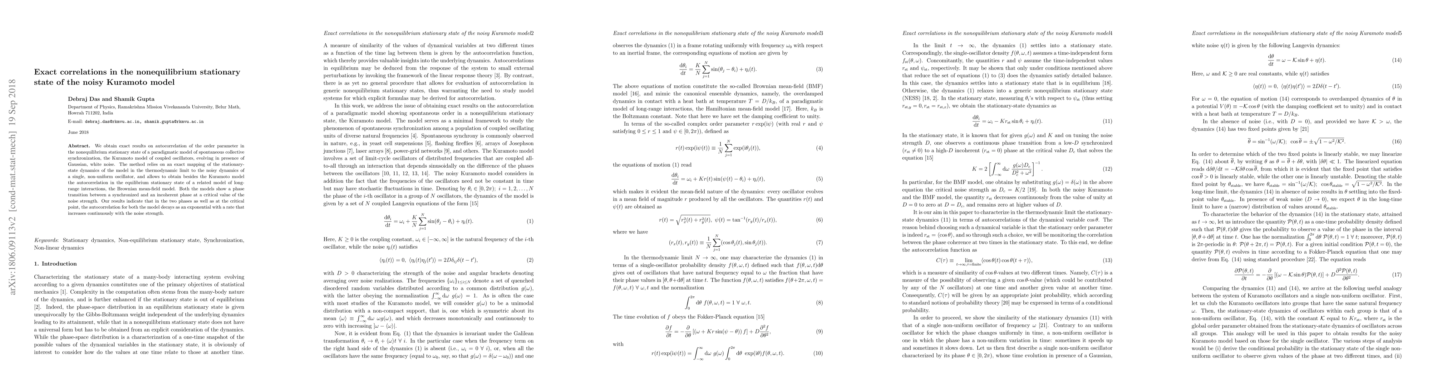 This paper derives exact results for the autocorrelation of the order parameter in the nonequilibrium stationary state of the Kuramoto model with Gaussian white noise, revealing a phase transition between synchronized and incoherent phases. The method maps the model to a single non-uniform oscillator, showing exponential decay of autocorrelation with a rate increasing continuously with noise strength.