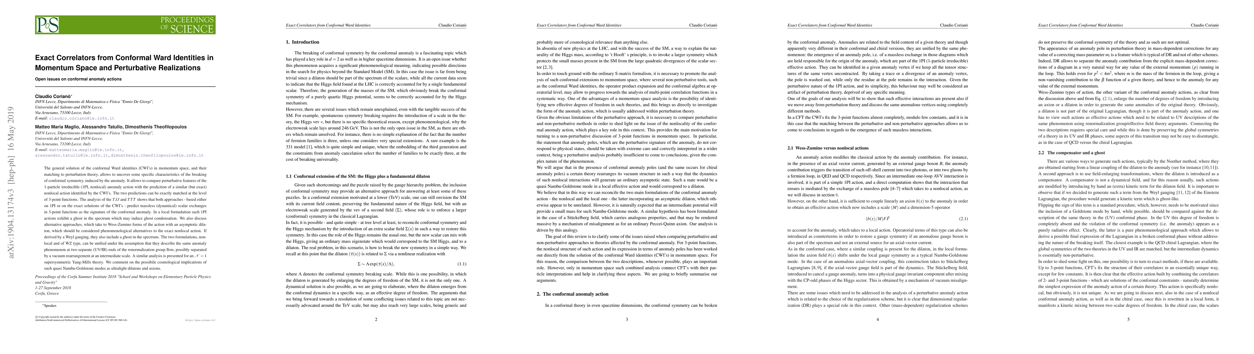 The general solution of the conformal Ward identities (CWI's) in momentum space, and their matching to perturbation theory, allows to uncover some specific characteristics of the breaking of conformal symmetry, induced by the anomaly. It allows to compare perturbative features of the 1-particle irreducible (1PI, nonlocal) anomaly action with the prediction of a similar (but exact) nonlocal action identified by the CWI's. The two predictions can be exactly matched at the level of 3-point functions. The analysis of the $TJJ$ and $TTT$ shows that both approaches - based either on 1PI or on the exact solutions of the CWI's - predict massless (dynamical) scalar exchanges in 3-point functions as the signature of the conformal anomaly. In a local formulation such 1PI actions exhibit a ghost in the spectrum which may induce ghost condensation. We also discuss alternative approaches, which take to Wess-Zumino forms of the action with an asymptotic dilaton, which should be considered phenomenological alternatives to the exact nonlocal action. If derived by a Weyl gauging, they also include a ghost in the spectrum. The two formulations, nonlocal and of WZ type, can be unified under the assumption that they describe the same anomaly phenomenon at two separate (UV/IR) ends of the renormalization group flow, possibly separated by a vacuum rearrangement at an intermediate scale. A similar analysis is presented for an $\mathcal{N}=1$ supersymmetric Yang-Mills theory. We comment on the possibile cosmological implications of such quasi Nambu-Goldstone modes as ultralight dilatons and axions.
