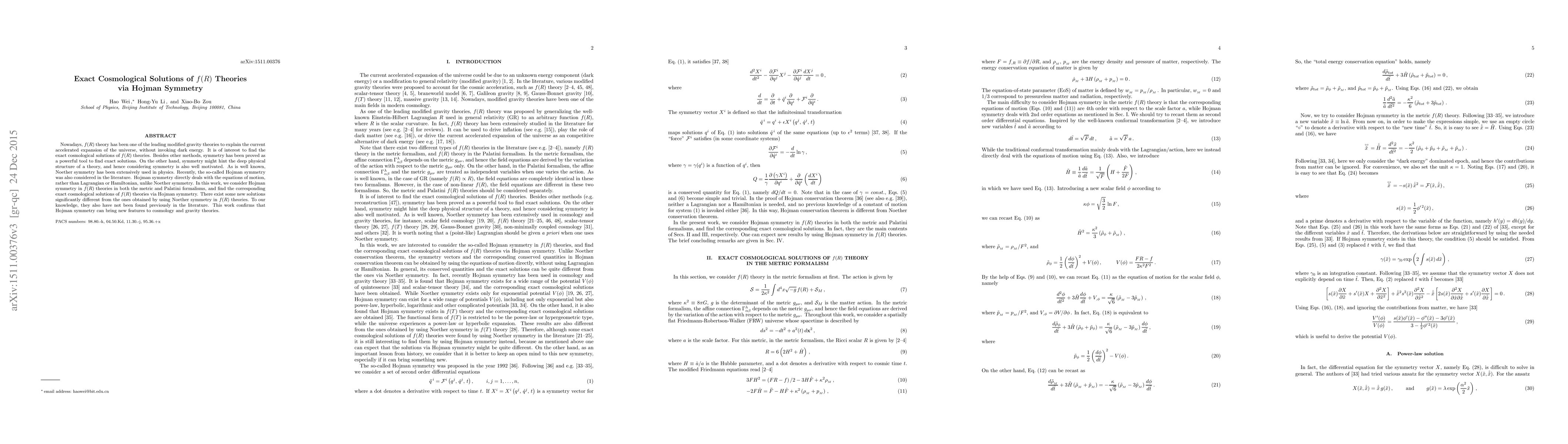 This paper explores exact cosmological solutions in $f(R)$ gravity theories using Hojman symmetry, finding new solutions distinct from those obtained via Noether symmetry. It demonstrates that Hojman symmetry offers novel insights into the physical structure of modified gravity theories.