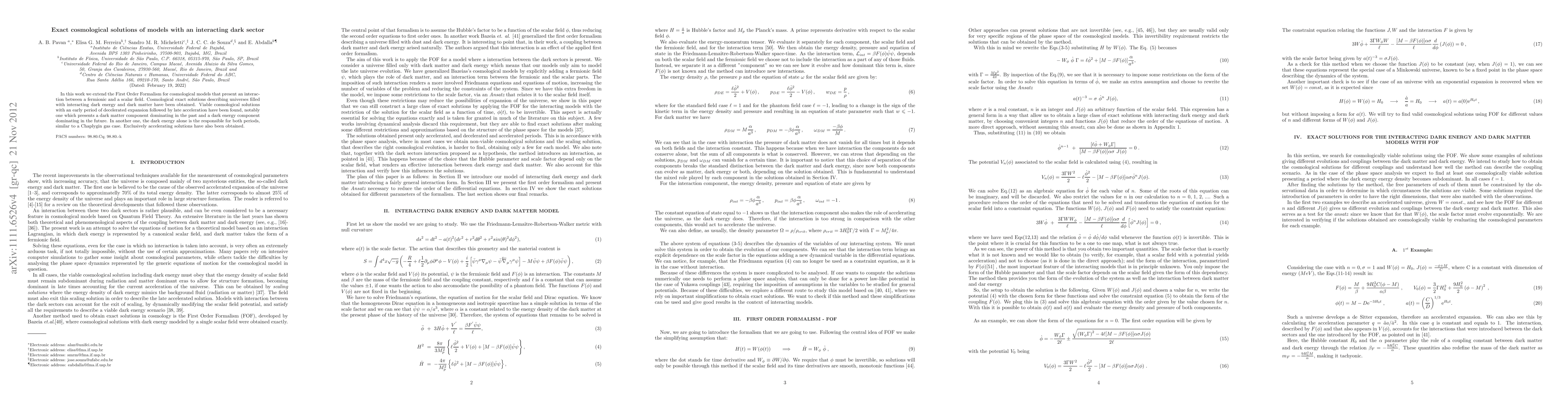 In this work we extend the first order formalism for cosmological models that present an interaction between a fermionic and a scalar field. Cosmological exact solutions describing universes filled with interacting dark energy and dark matter have been obtained. Viable cosmological solutions with an early period of decelerated expansion followed by late acceleration have been found, notably one which presents a dark matter component dominating in the past and a dark energy component dominating in the future. In another one, the dark energy alone is the responsible for both periods, similar to a Chaplygin gas case. Exclusively accelerating solutions have also been obtained.