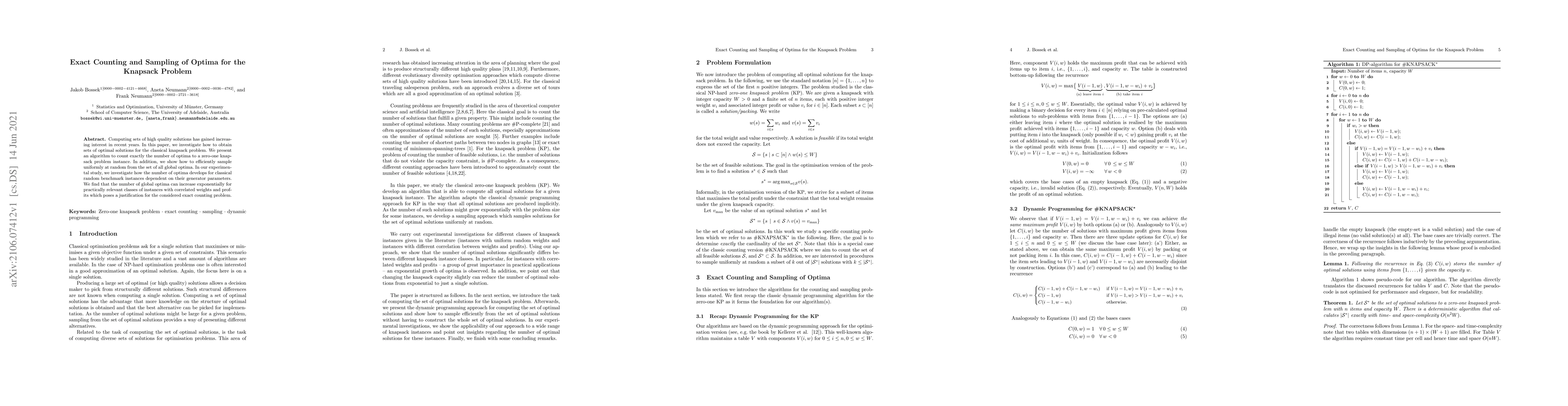Researchers developed an algorithm to count the exact number of optimal solutions for the knapsack problem and efficiently sample random solutions from these sets. The study found that the number of global optima can increase exponentially for certain classes of instances with correlated weights and profits.