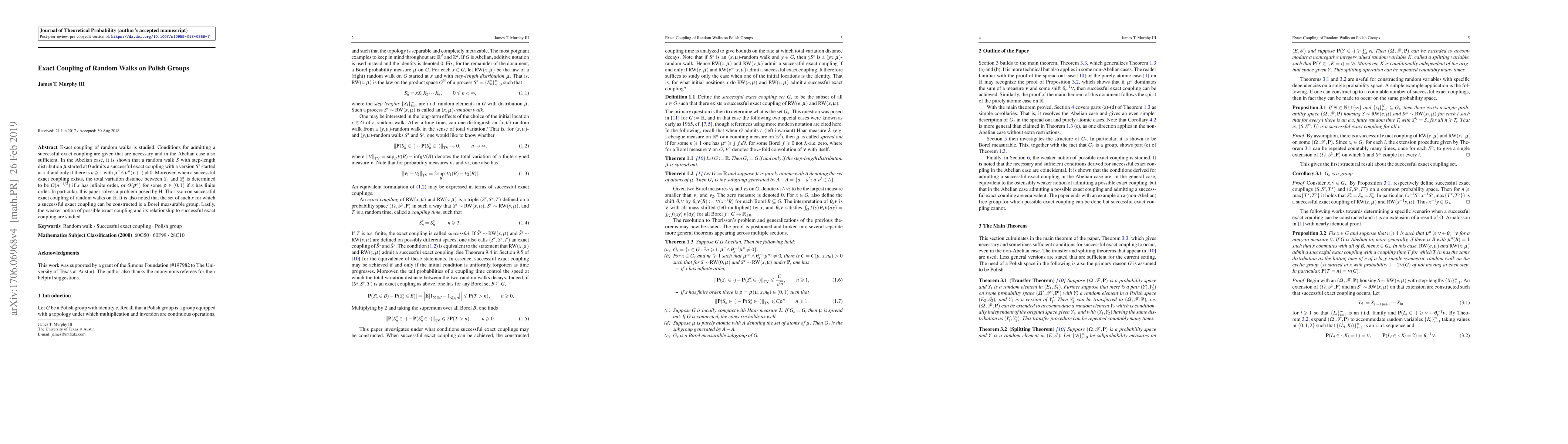 Exact coupling of random walks is studied. Conditions for admitting a successful exact coupling are given that are necessary and in the Abelian case also sufficient. In the Abelian case, it is shown that a random walk $S$ with step-length distribution $\mu$ started at $0$ admits a successful exact coupling with a version $S^x$ started at $x$ if and only if there is $n\geq 1$ with $\mu^{n} \wedge \mu^{n}(x+\cdot) \neq 0$. Moreover, when a successful exact coupling exists, the total variation distance between $S_n$ and $S^x_n$ is determined to be $O(n^{-1/2})$ if $x$ has infinite order, or $O(\rho^n)$ for some $\rho \in (0,1)$ if $x$ has finite order. In particular, this paper solves a problem posed by H. Thorisson on successful exact coupling of random walks on $\mathbb{R}$. It is also noted that the set of such $x$ for which a successful exact coupling can be constructed is a Borel measurable group. Lastly, the weaker notion of possible exact coupling and its relationship to successful exact coupling are studied.