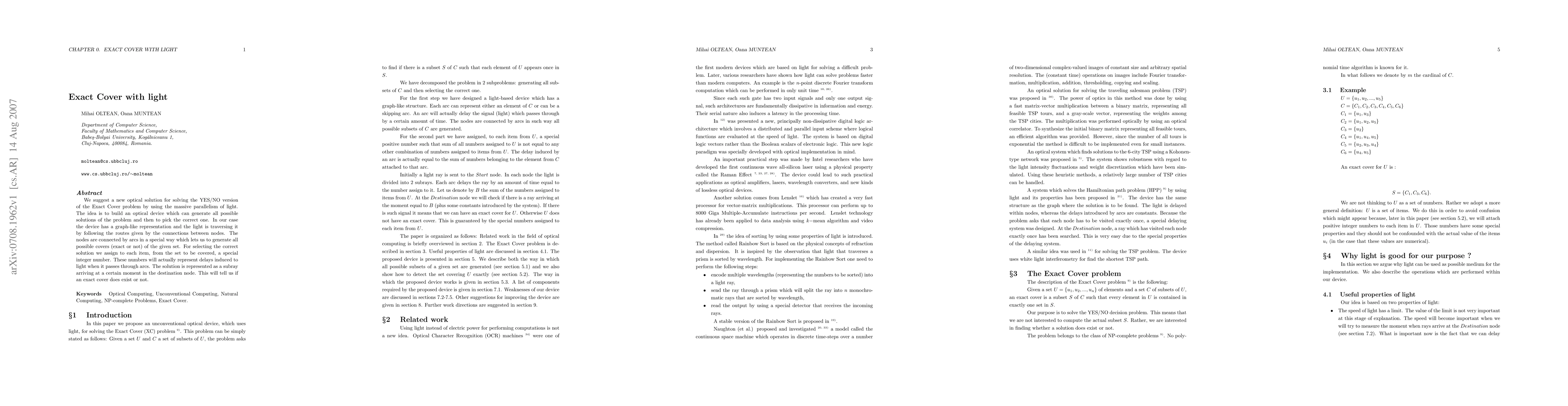 We suggest a new optical solution for solving the YES/NO version of the Exact Cover problem by using the massive parallelism of light. The idea is to build an optical device which can generate all possible solutions of the problem and then to pick the correct one. In our case the device has a graph-like representation and the light is traversing it by following the routes given by the connections between nodes. The nodes are connected by arcs in a special way which lets us to generate all possible covers (exact or not) of the given set. For selecting the correct solution we assign to each item, from the set to be covered, a special integer number. These numbers will actually represent delays induced to light when it passes through arcs. The solution is represented as a subray arriving at a certain moment in the destination node. This will tell us if an exact cover does exist or not.