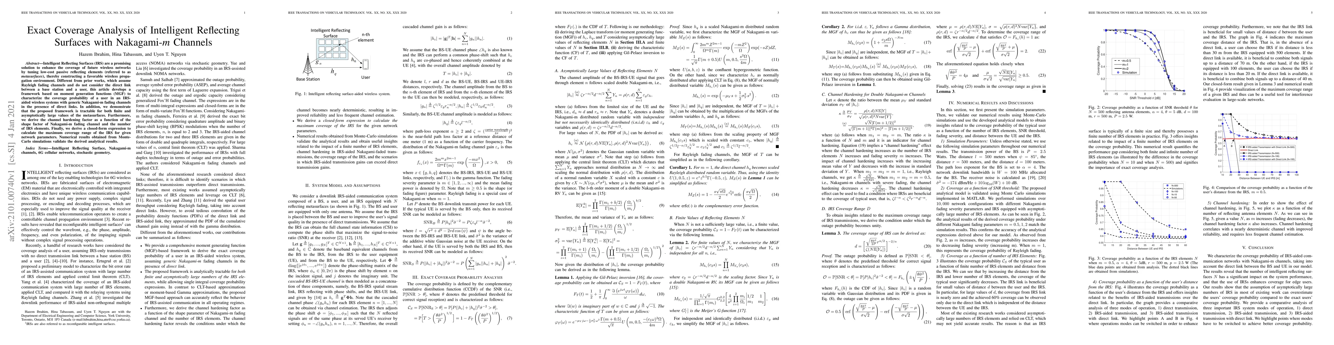 Intelligent Reflecting Surfaces (IRS) are a promising solution to enhance the coverage of future wireless networks by tuning low-cost passive reflecting elements (referred to as {metasurfaces}), thereby constructing a favorable wireless propagation environment. Different from prior works, which assume Rayleigh fading channels and do not consider the direct link between a base station and a user, this article develops a framework based on moment generation functions (MGF) to characterize the coverage probability of a user in an IRS-aided wireless systems with generic Nakagami-m fading channels in the presence of direct links. In addition, we demonstrate that the proposed framework is tractable for both finite and asymptotically large values of the metasurfaces. Furthermore, we derive the channel hardening factor as a function of the shape factor of Nakagami-m fading channel and the number of IRS elements. Finally, we derive a closed-form expression to calculate the maximum coverage range of the IRS for given network parameters. Numerical results obtained from Monte-Carlo simulations validate the derived analytical results.
