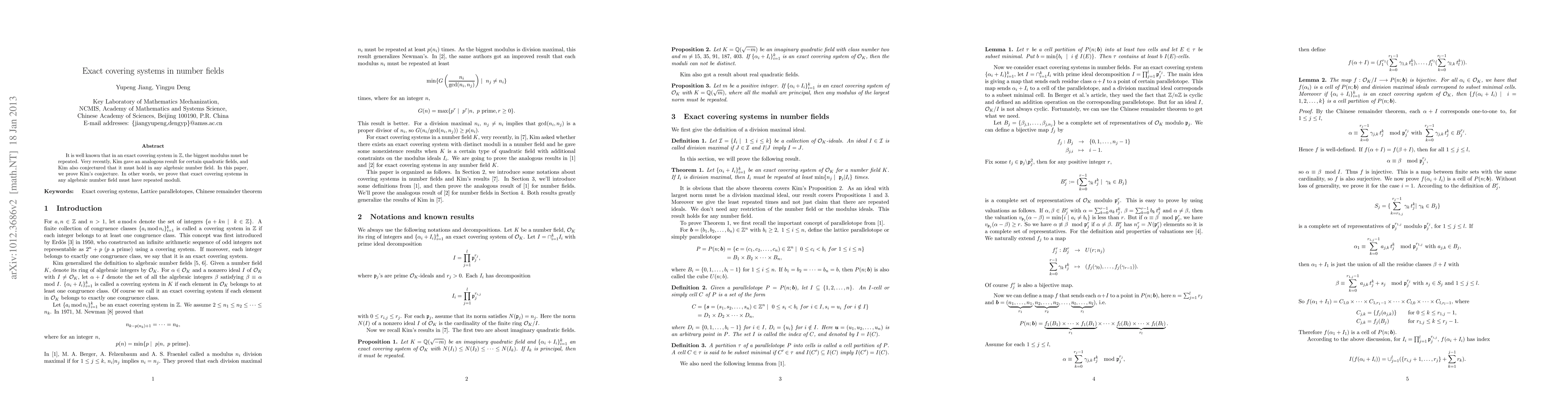 The paper proves Kim's conjecture by demonstrating that exact covering systems in any algebraic number field must have repeated moduli, using bijective maps and properties of ideals in number fields.