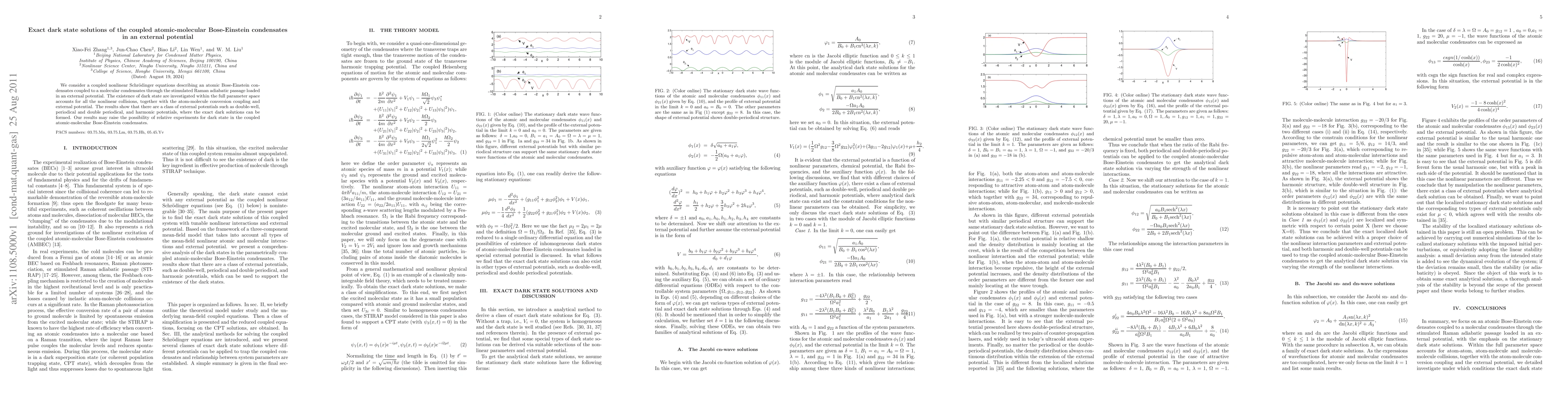 This paper investigates exact dark state solutions in coupled atomic-molecular Bose-Einstein condensates under various external potentials, revealing that potentials like double-well, periodic, and harmonic can support these dark states. The findings suggest potential experimental avenues for studying dark states in such systems.