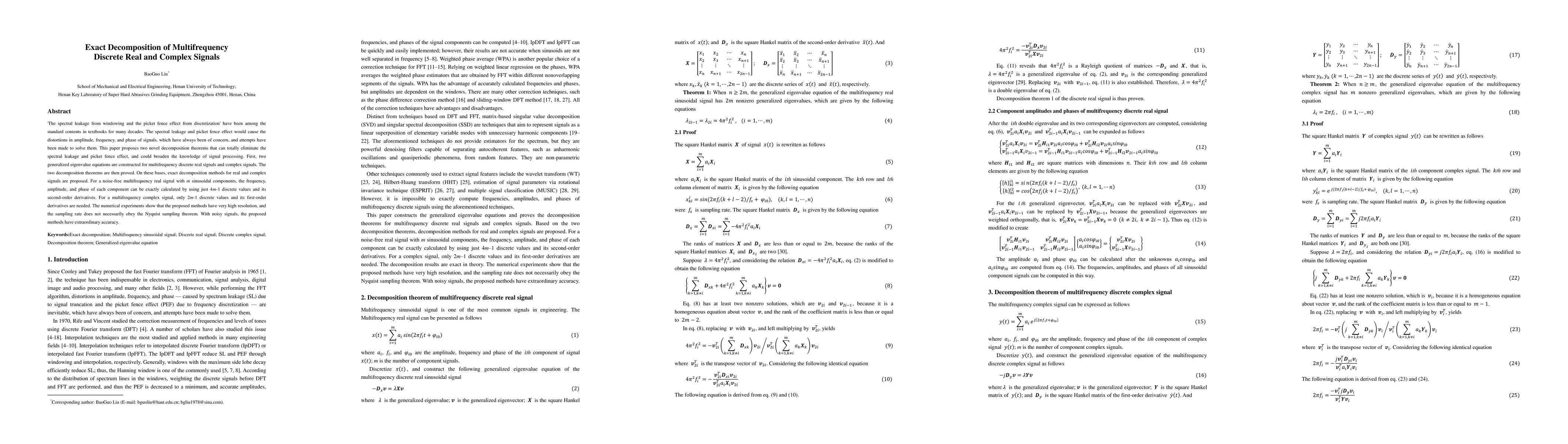 Researchers propose two novel decomposition theorems to eliminate spectral leakage and picket fence effects in signal processing, enabling exact frequency, amplitude, and phase calculations with limited discrete values.