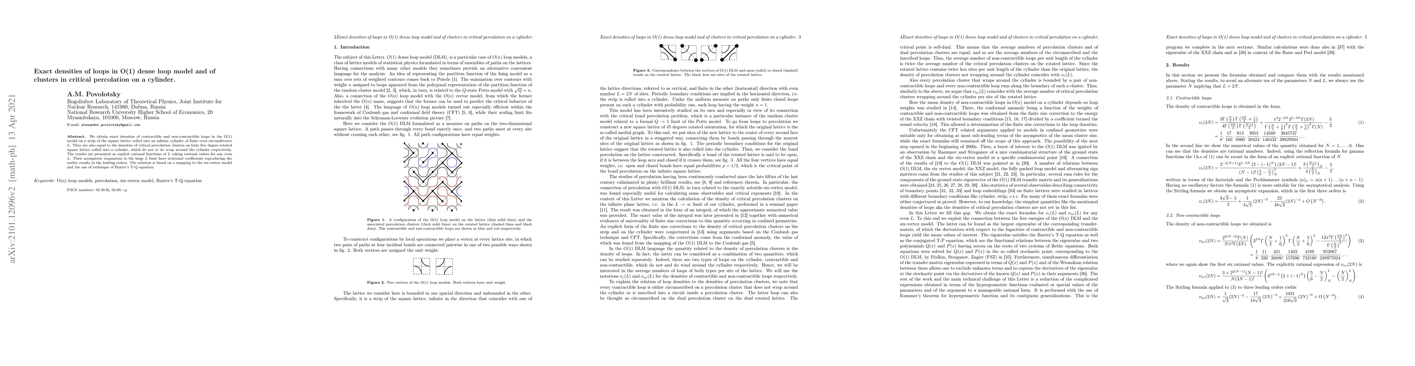 This paper provides exact densities for loops in the O(1) dense loop model and percolation clusters in critical percolation on a cylinder, showing they are equivalent. The results are expressed as rational functions of cylinder circumference $L$ with rational values for even $L$, and their large $L$ asymptotics match previous findings.