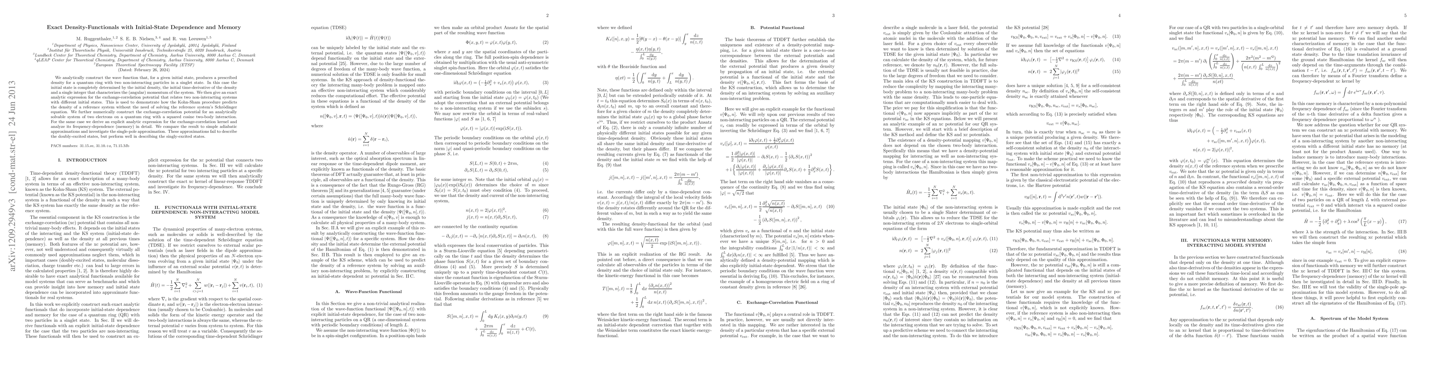 We analytically construct the wave function that, for a given initial state, produces a prescribed density for a quantum ring with two non-interacting particles in a singlet state. In this case the initial state is completely determined by the initial density, the initial time-derivative of the density and a single integer that characterizes the (angular) momentum of the system. We then give an exact analytic expression for the exchange-correlation potential that relates two non-interacting systems with different initial states. This is used to demonstrate how the Kohn-Sham procedure predicts the density of a reference system without the need of solving the reference system's Schr\"odinger equation. We further numerically construct the exchange-correlation potential for an analytically solvable system of two electrons on a quantum ring with a squared cosine two-body interaction. For the same case we derive an explicit analytic expression for the exchange-correlation kernel and analyze its frequency-dependence (memory) in detail. We compare the result to simple adiabatic approximations and investigate the single-pole approximation. These approximations fail to describe the doubly-excited states, but perform well in describing the singly-excited states.