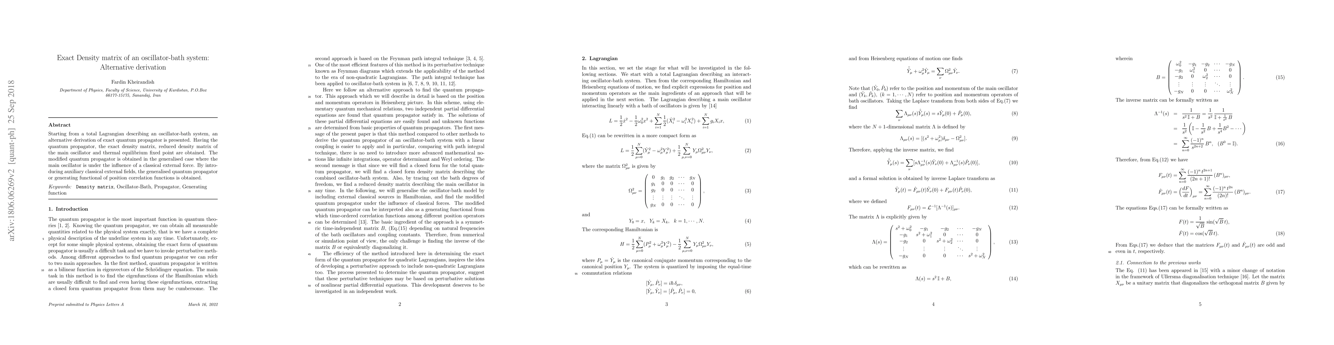 This paper presents a new derivation of the exact quantum propagator for an oscillator-bath system from a total Lagrangian, leading to the exact density matrix and reduced density matrix of the main oscillator. It also generalizes the approach to include classical external forces using auxiliary fields.