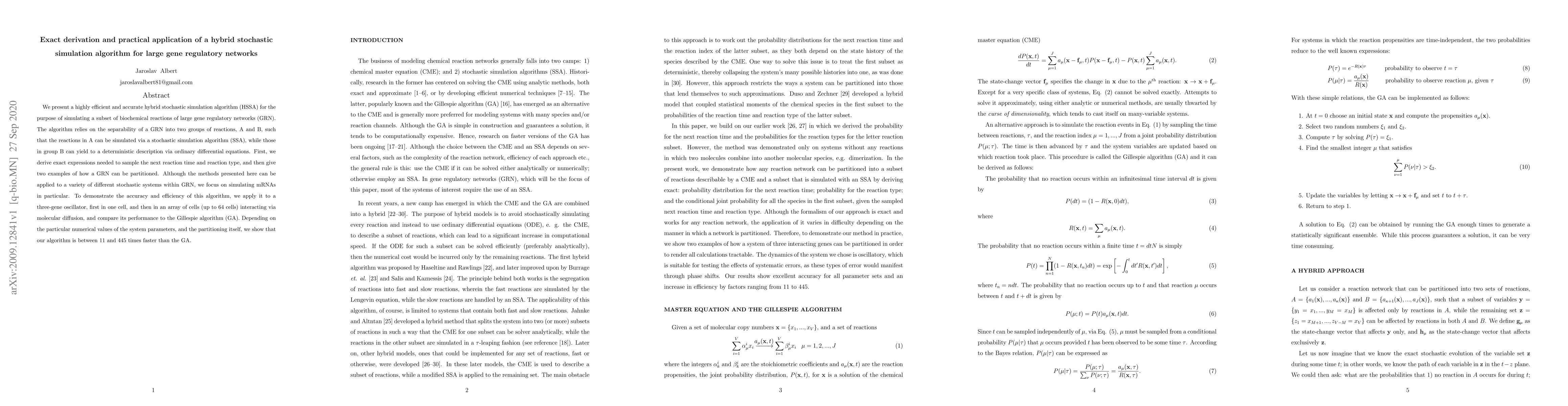 This paper introduces a hybrid stochastic simulation algorithm (HSSA) for efficiently simulating large gene regulatory networks by partitioning reactions into stochastic and deterministic groups. The authors demonstrate its accuracy and efficiency by applying it to a three-gene oscillator, showing it can be up to 445 times faster than the traditional Gillespie algorithm.