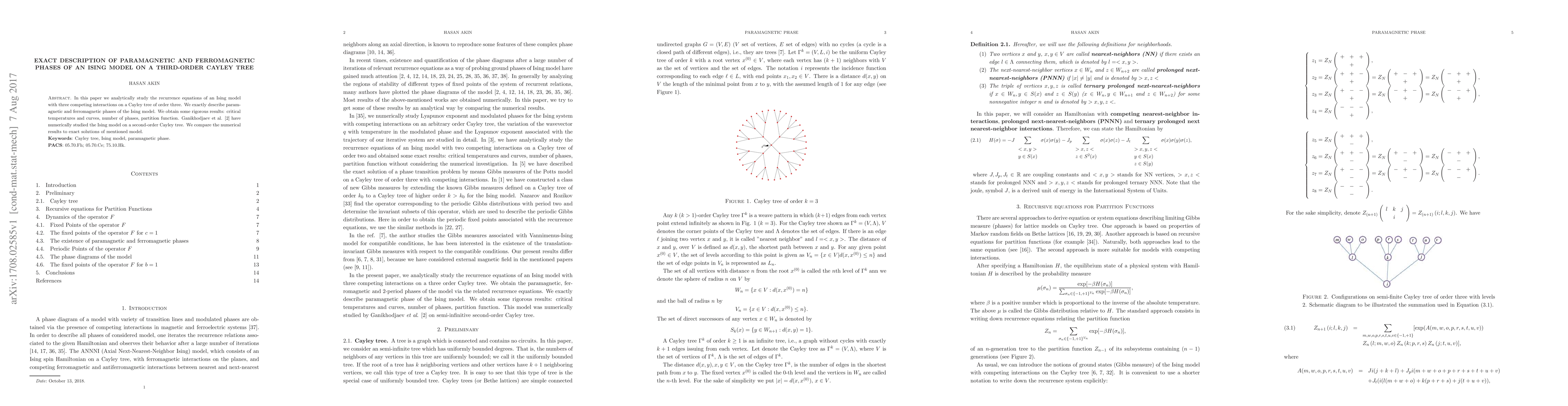 Researchers analytically study an Ising model on a third-order Cayley tree with three competing interactions, exactly describing its paramagnetic and ferromagnetic phases and comparing them to previous numerical results.