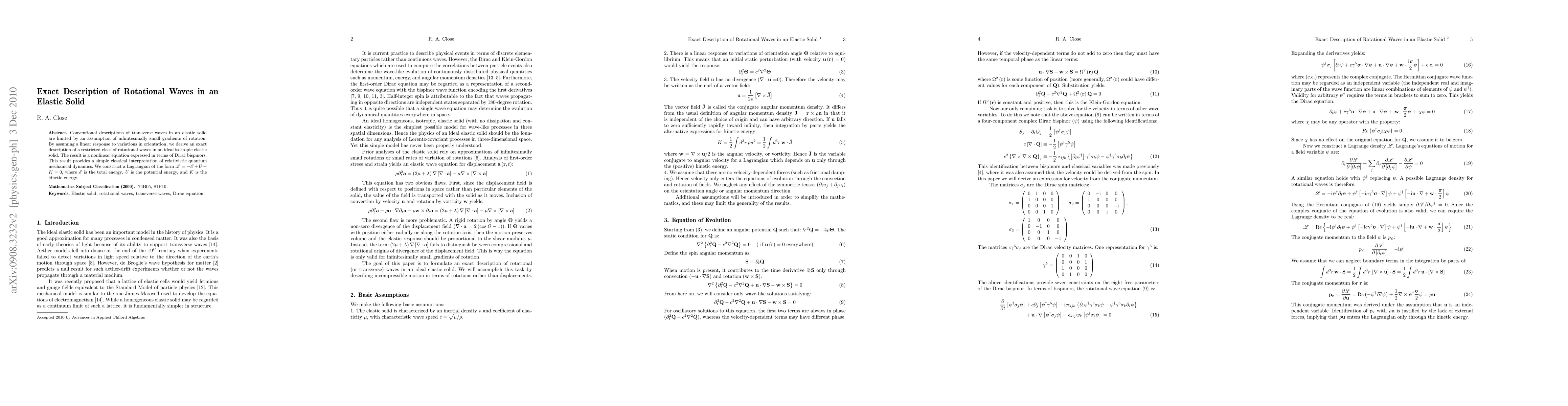 Conventional descriptions of transverse waves in an elastic solid are limited by an assumption of infinitesimally small gradients of rotation. By assuming a linear response to variations in orientation, we derive an exact description of a restricted class of rotational waves in an ideal isotropic elastic solid. The result is a nonlinear equation expressed in terms of Dirac bispinors. This result provides a simple classical interpretation of relativistic quantum mechanical dynamics. We construct a Lagrangian of the form L=-E+U+K=0, where E is the total energy, U is the potential energy, and K is the kinetic energy.