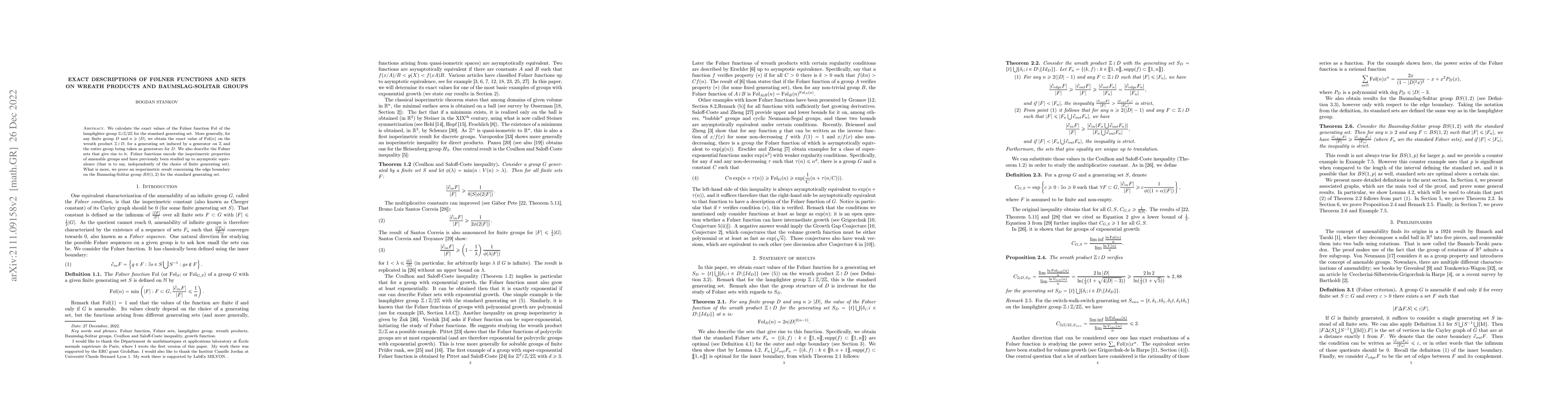 This paper calculates exact F{\o}lner functions for the lamplighter group $\mathbb{Z}\wr\mathbb{Z}/2\mathbb{Z}$ and general wreath products $\mathbb{Z}\wr D$, providing explicit values for $\mathrm{F{\o}l}(n)$. It also describes the F{\o}lner sets involved and proves an isoperimetric result for the edge boundary in the Baumslag-Solitar group $BS(1,2)$.