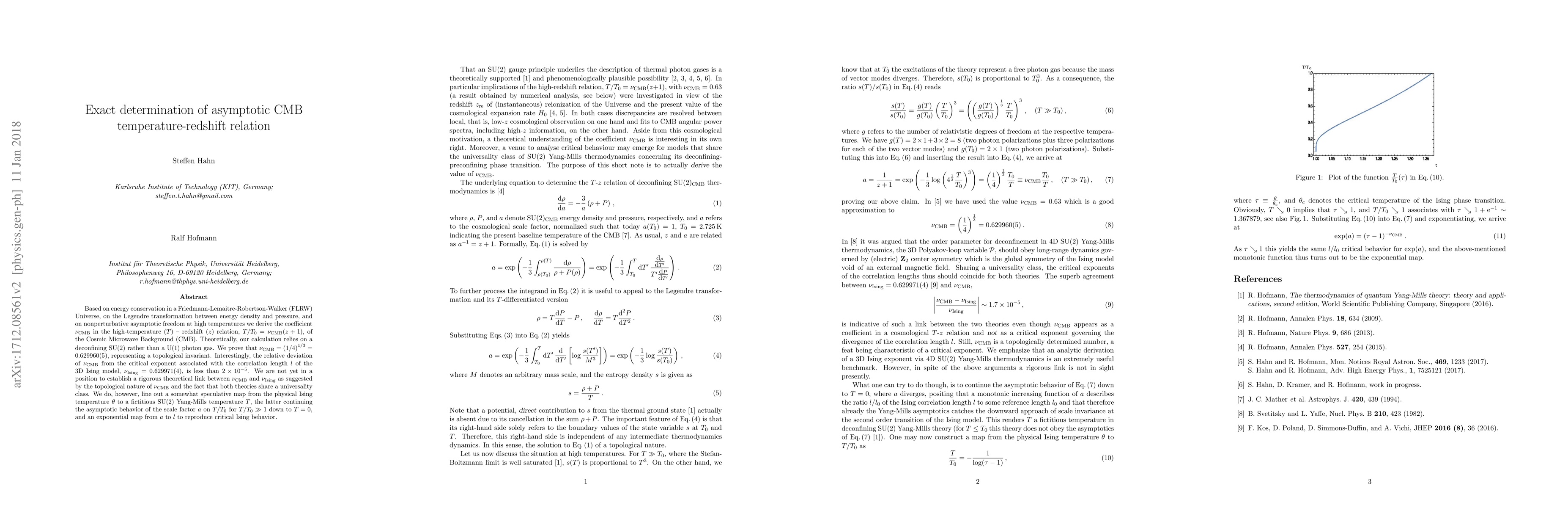 Based on energy conservation in a Friedmann-Lemaitre-Robertson-Walker (FLRW) Universe, on the Legendre transformation between energy density and pressure, and on nonperturbative asymptotic freedom at high temperatures we derive the coefficient $\nu_{\rm CMB}$ in the high-temperature ($T$) -- redshift ($z$) relation, $T/T_0=\nu_{\rm CMB}(z+1)$, of the Cosmic Microwave Background (CMB). Theoretically, our calculation relies on a deconfining SU(2) rather than a U(1) photon gas. We prove that $\nu_{\rm CMB}=\left(1/4\right)^{1/3}=0.629960(5)$, representing a topological invariant. Interestingly, the relative deviation of $\nu_{\rm CMB}$ from the critical exponent associated with the correlation length $l$ of the 3D Ising model, $\nu_{\rm Ising}=0.629971(4)$, is less than $2\times 10^{-5}$. We are not yet in a position to establish a rigorous theoretical link between $\nu_{\rm CMB}$ and $\nu_{\rm Ising}$ as suggested by the topological nature of $\nu_{\rm CMB}$ and the fact that both theories share a universality class. We do, however, line out a somewhat speculative map from the physical Ising temperature $\theta$ to a fictitious SU(2) Yang-Mills temperature $T$, the latter continuing the asymptotic behavior of the scale factor $a$ on $T/T_0$ for $T/T_0\gg 1$ down to $T=0$, and an exponential map from $a$ to $l$ to reproduce critical Ising behavior.