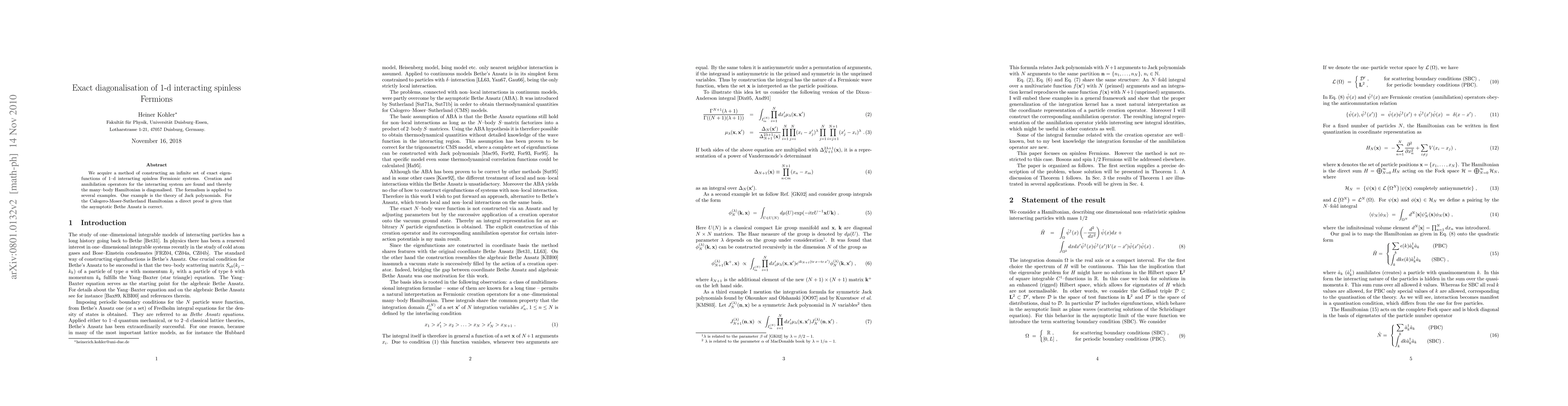 This paper presents a method for constructing exact eigenfunctions of 1-d interacting spinless Fermionic systems, utilizing creation and annihilation operators to diagonalise the many-body Hamiltonian. The formalism is demonstrated through examples, including the theory of Jack polynomials and a proof for the correctness of the asymptotic Bethe Ansatz in the Calogero-Moser-Sutherland Hamiltonian.
