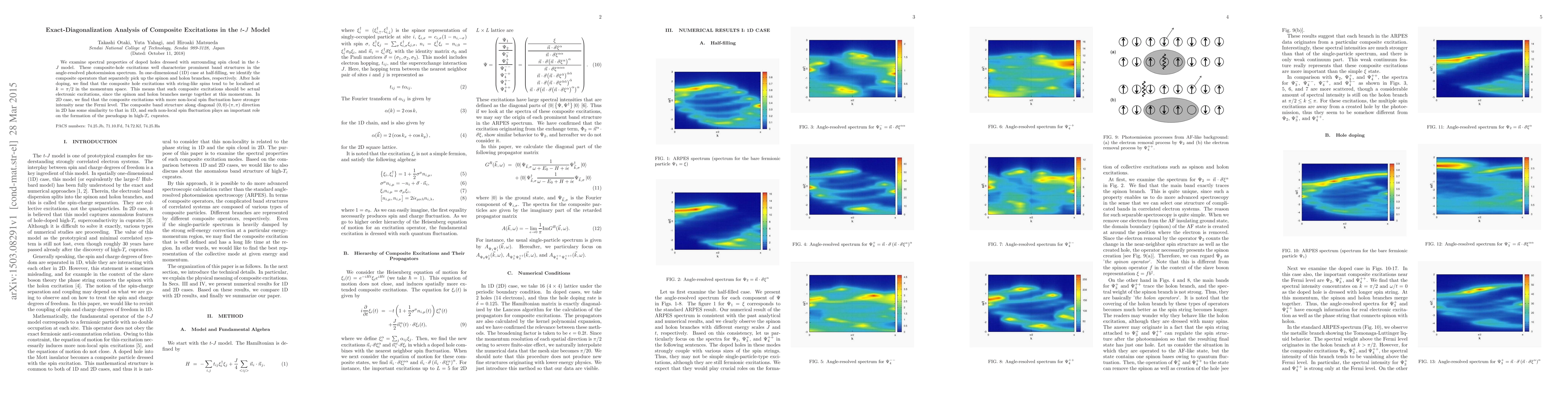 This paper uses exact-diagonalization to analyze composite excitations in the t-J model, identifying localized composite hole excitations in 1D and non-local spin fluctuations in 2D that contribute to the pseudogap in high-Tc cuprates. The study highlights the merging of spinon and holon branches at k=π/2 in 1D and the role of spin fluctuations near the Fermi level in 2D.