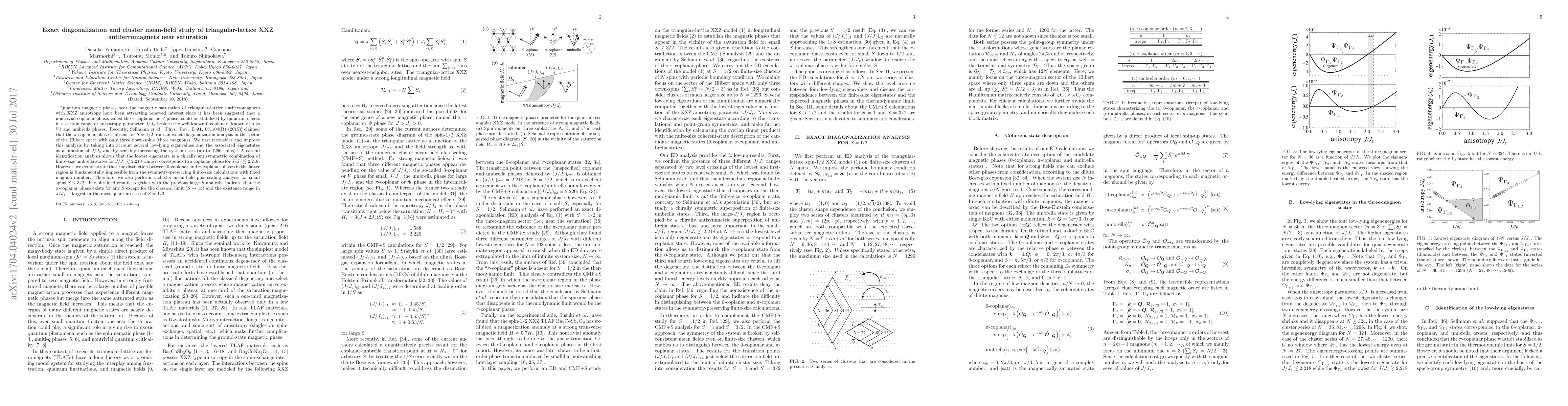 Quantum magnetic phases near the magnetic saturation of triangular-lattice antiferromagnets with XXZ anisotropy have been attracting renewed interest since it has been suggested that a nontrivial coplanar phase, called the $\pi$-coplanar or $\Psi$ phase, could be stabilized by quantum effects in a certain range of anisotropy parameter $J/J_z$ besides the well-known 0-coplanar (known also as $V$) and umbrella phases. Recently, Sellmann $et$ $al$. [Phys. Rev. B {\bf 91}, 081104(R) (2015)] claimed that the $\pi$-coplanar phase is absent for $S=1/2$ from an exact-diagonalization analysis in the sector of the Hilbert space with only three down-spins (three magnons). We first reconsider and improve this analysis by taking into account several low-lying eigenvalues and the associated eigenstates as a function of $J/J_z$ and by sensibly increasing the system sizes (up to 1296 spins). A careful identification analysis shows that the lowest eigenstate is a chirally antisymmetric combination of finite-size umbrella states for $J/J_z\gtrsim 2.218$ while it corresponds to a coplanar phase for $J/J_z\lesssim 2.218$. However, we demonstrate that the distinction between 0-coplanar and $\pi$-coplanar phases in the latter region is fundamentally impossible from the symmetry-preserving finite-size calculations with fixed magnon number.} Therefore, we also perform a cluster mean-field plus scaling analysis for small spins $S\leq 3/2$. The obtained results, together with the previous large-$S$ analysis, indicate that the $\pi$-coplanar phase exists for any $S$ except for the classical limit ($S\rightarrow \infty$) and the existence range in $J/J_z$ is largest in the most quantum case of $S=1/2$.