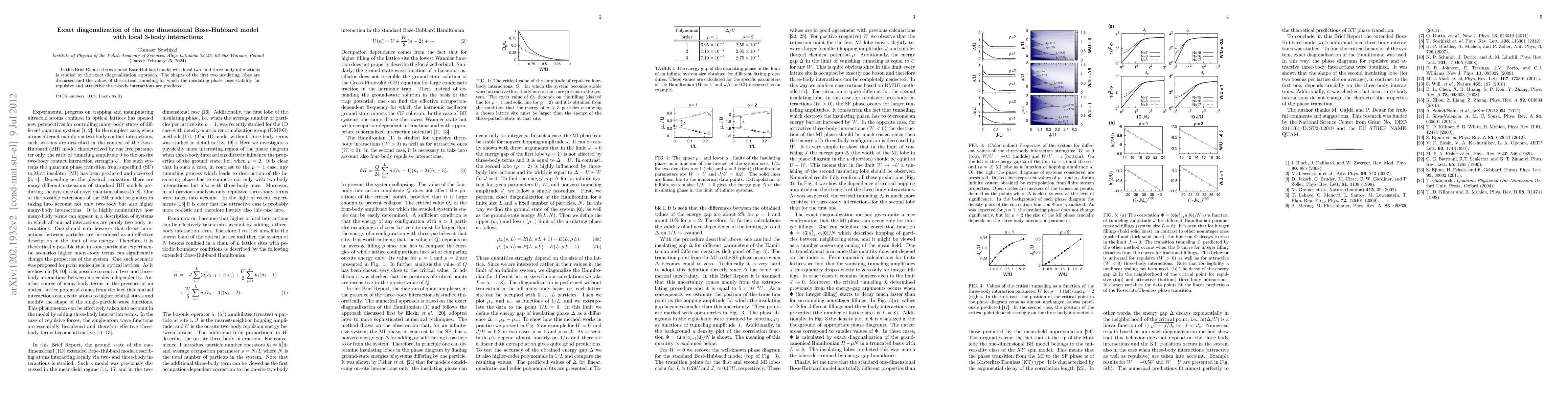 In this Brief Report the extended Bose-Hubbard model with local two- and three-body interactions is studied by the exact diagonalization approach. The shapes of the first two insulating lobes are discussed and the values of the critical tunneling for which the insulating phase loses stability for repulsive and attractive three-body interactions are predicted.