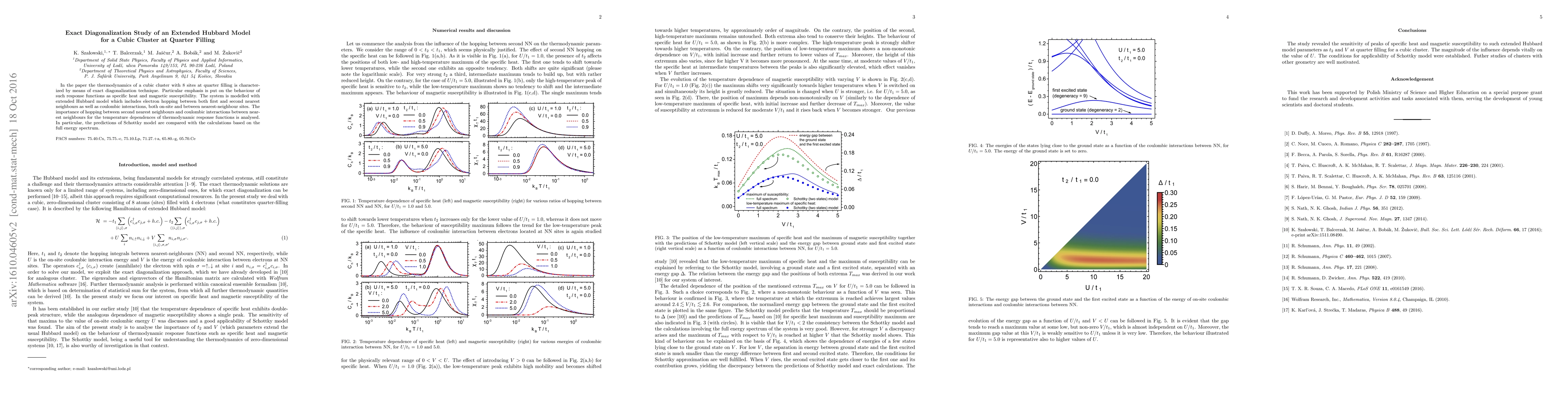 In the paper the thermodynamics of a cubic cluster with 8 sites at quarter filling is characterized by means of exact diagonalization technique. Particular emphasis is put on the behaviour of such response functions as specific heat and magnetic susceptibility. The system is modelled with extended Hubbard model which includes electron hopping between both first and second nearest neighbours as well as coulombic interactions, both on-site and between nearest-neighbour sites. The importance of hopping between second nearest neighbours and coulombic interactions between nearest neighbours for the temperature dependences of thermodynamic response functions is analysed. In particular, the predictions of Schottky model are compared with the calculations based on the full energy spectrum.