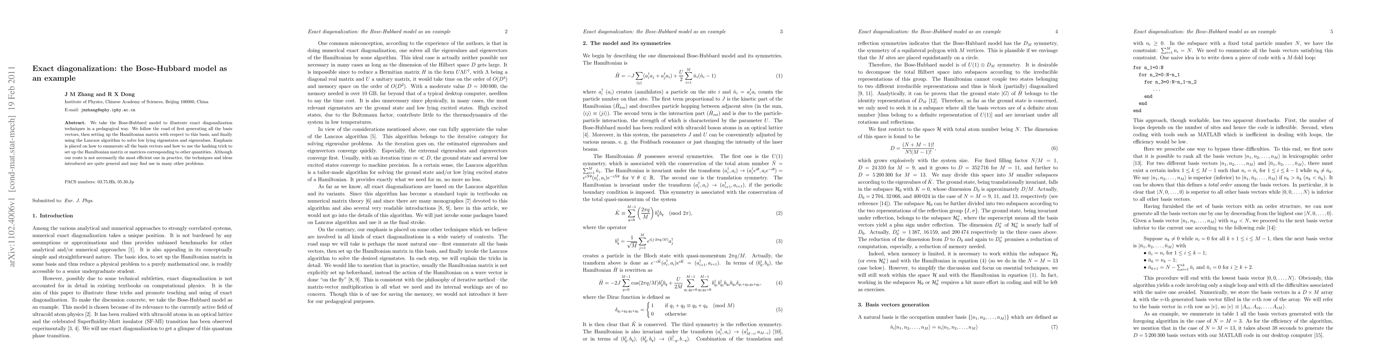This paper demonstrates exact diagonalization techniques using the Bose-Hubbard model to find low-lying eigenstates and eigenvalues. It provides a pedagogical approach to generating basis vectors and setting up Hamiltonian matrices for other quantities.