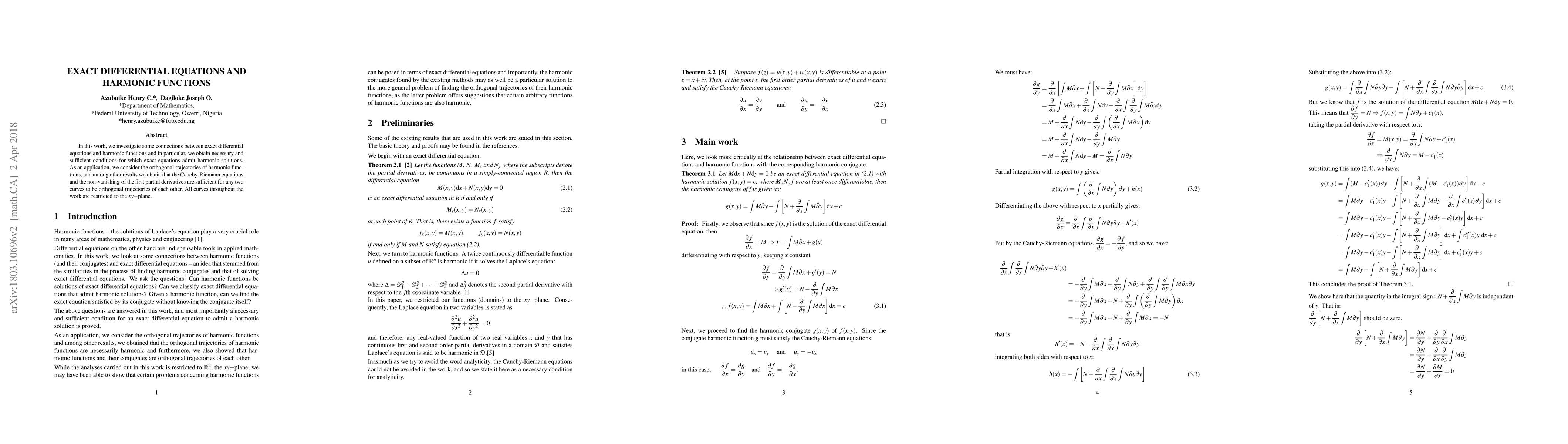 This paper explores the relationship between exact differential equations and harmonic functions, establishing necessary and sufficient conditions for exact equations to have harmonic solutions. It also demonstrates that the Cauchy-Riemann equations and non-vanishing first partial derivatives ensure orthogonal trajectories for curves in the xy-plane.
