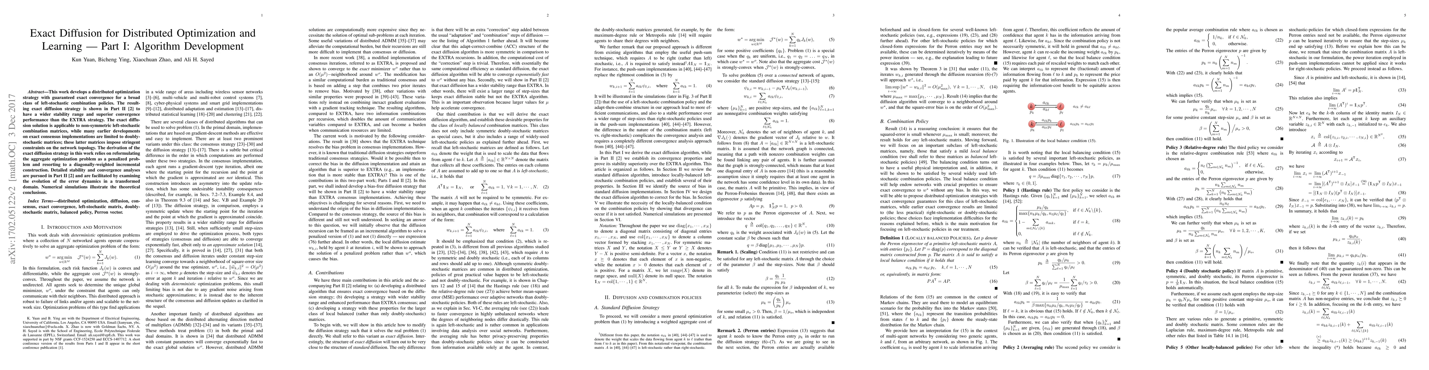 This work develops a distributed optimization strategy with guaranteed exact convergence for a broad class of left-stochastic combination policies. The resulting exact diffusion strategy is shown in Part II to have a wider stability range and superior convergence performance than the EXTRA strategy. The exact diffusion solution is applicable to non-symmetric left-stochastic combination matrices, while many earlier developments on exact consensus implementations are limited to doubly-stochastic matrices; these latter matrices impose stringent constraints on the network topology. The derivation of the exact diffusion strategy in this work relies on reformulating the aggregate optimization problem as a penalized problem and resorting to a diagonally-weighted incremental construction. Detailed stability and convergence analyses are pursued in Part II and are facilitated by examining the evolution of the error dynamics in a transformed domain. Numerical simulations illustrate the theoretical conclusions.
