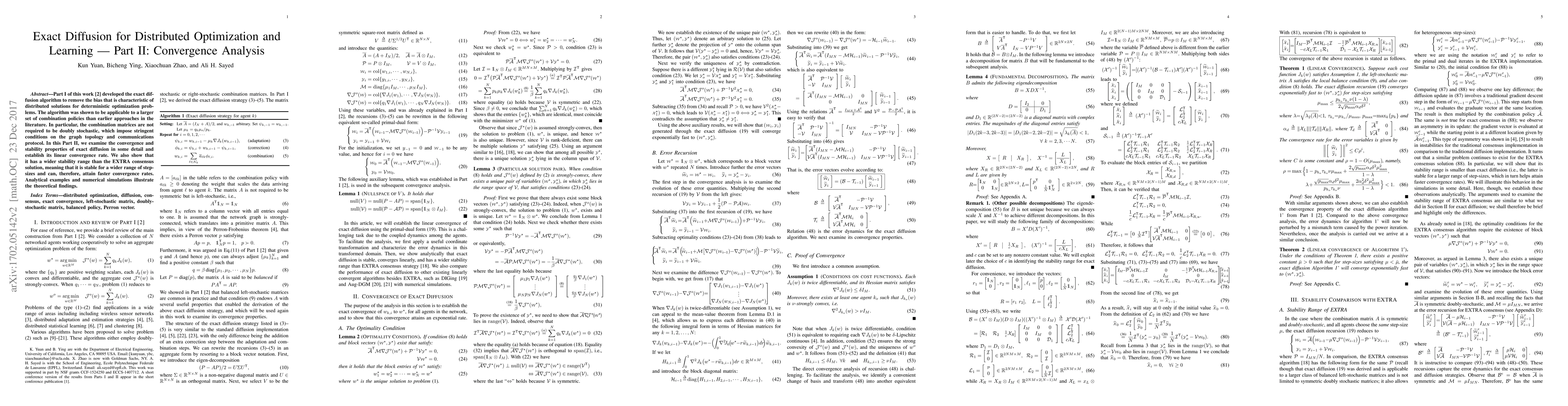 The paper analyzes the convergence properties of exact diffusion for distributed optimization and learning, establishing a linear convergence rate and demonstrating wider stability range than existing solutions.