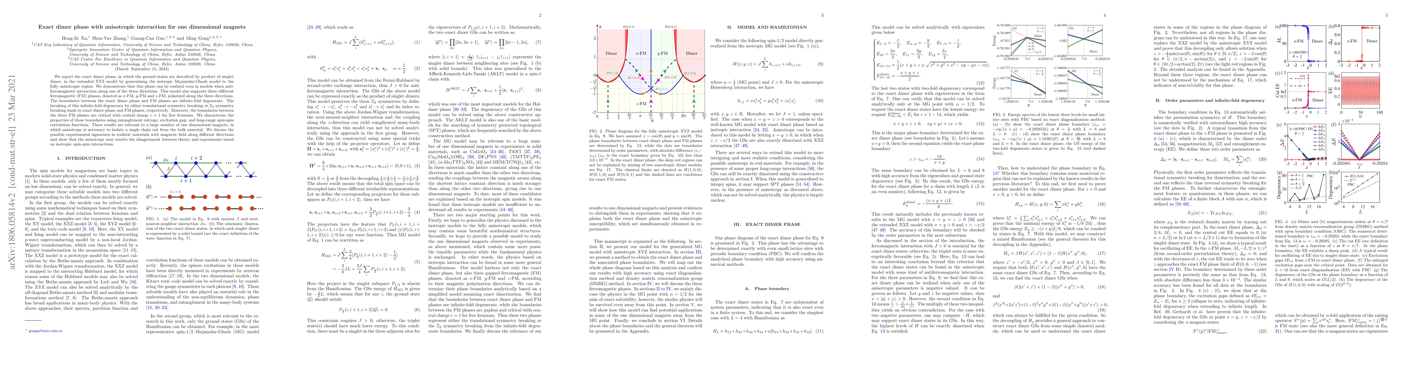We report the exact dimer phase, in which the ground states are described by product of singlet dimer, in the extended XYZ model by generalizing the isotropic Majumdar-Ghosh model to the fully anisotropic region. We demonstrate that this phase can be realized even in models when antiferromagnetic interaction along one of the three directions. This model also supports three different ferromagnetic (FM) phases, denoted as $x$-FM, $y$-FM and $z$-FM, polarized along the three directions. The boundaries between the exact dimer phase and FM phases are infinite-fold degenerate. The breaking of this infinite-fold degeneracy by either translational symmetry breaking or $\mathbb{Z}_2$ symmetry breaking leads to exact dimer phase and FM phases, respectively. Moreover, the boundaries between the three FM phases are critical with central charge $c=1$ for free fermions. We characterize the properties of these boundaries using entanglement entropy, excitation gap, and long-range spin-spin correlation functions. These results are relevant to a large number of one dimensional magnets, in which anisotropy is necessary to isolate a single chain out from the bulk material. We discuss the possible experimental signatures in realistic materials with magnetic field along different directions and show that the anisotropy may resolve the disagreement between theory and experiments based on isotropic spin-spin interactions.