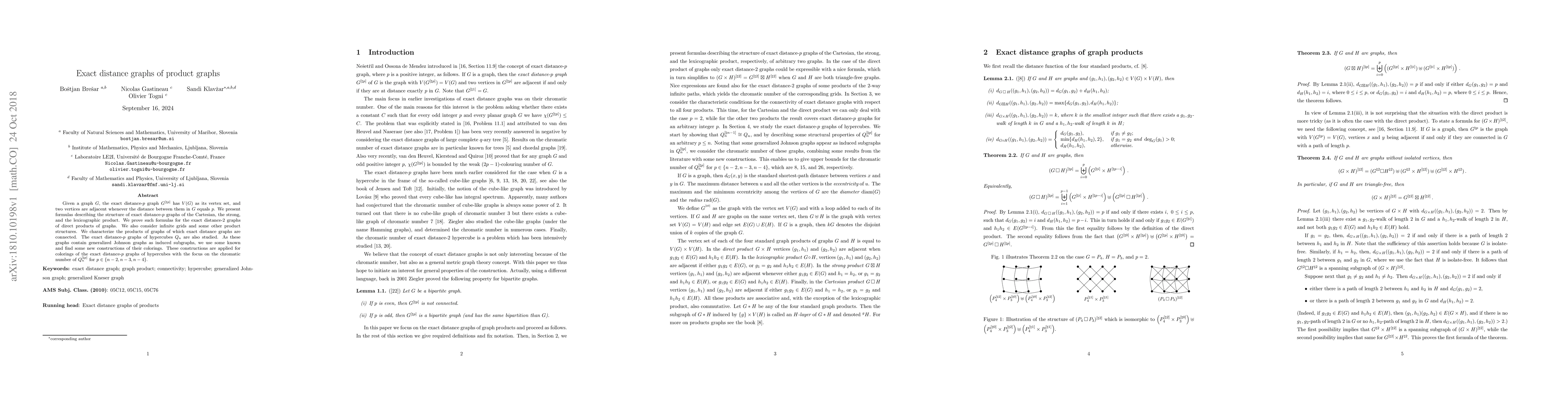 Given a graph $G$, the exact distance-$p$ graph $G^{[\natural p]}$ has $V(G)$ as its vertex set, and two vertices are adjacent whenever the distance between them in $G$ equals $p$. We present formulas describing the structure of exact distance-$p$ graphs of the Cartesian, the strong, and the lexicographic product. We prove such formulas for the exact distance-$2$ graphs of direct products of graphs. We also consider infinite grids and some other product structures. We characterize the products of graphs of which exact distance graphs are connected. The exact distance-$p$ graphs of hypercubes $Q_n$ are also studied. As these graphs contain generalized Johnson graphs as induced subgraphs, we use some known and find some new constructions of their colorings. These constructions are applied for colorings of the exact distance-$p$ graphs of hypercubes with the focus on the chromatic number of $Q_{n}^{[\natural p]}$ for $p\in \{n-2,n-3,n-4\}$.