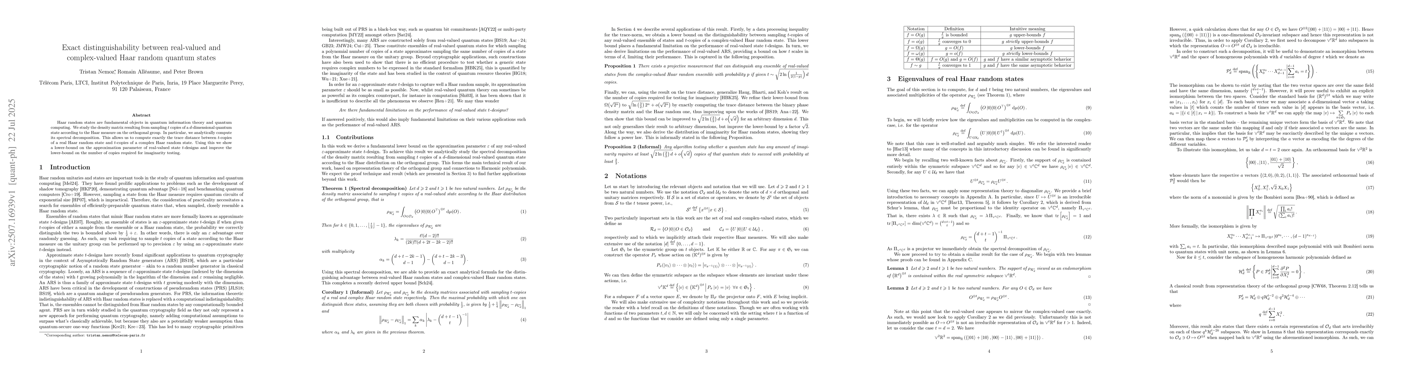 Haar random states are fundamental objects in quantum information theory and quantum computing. We study the density matrix resulting from sampling $t$ copies of a $d$-dimensional quantum state according to the Haar measure on the orthogonal group. In particular, we analytically compute its spectral decomposition. This allows us to compute exactly the trace distance between $t$-copies of a real Haar random state and $t$-copies of a complex Haar random state. Using this we show a lower-bound on the approximation parameter of real-valued state $t$-designs and improve the lower-bound on the number of copies required for imaginarity testing.