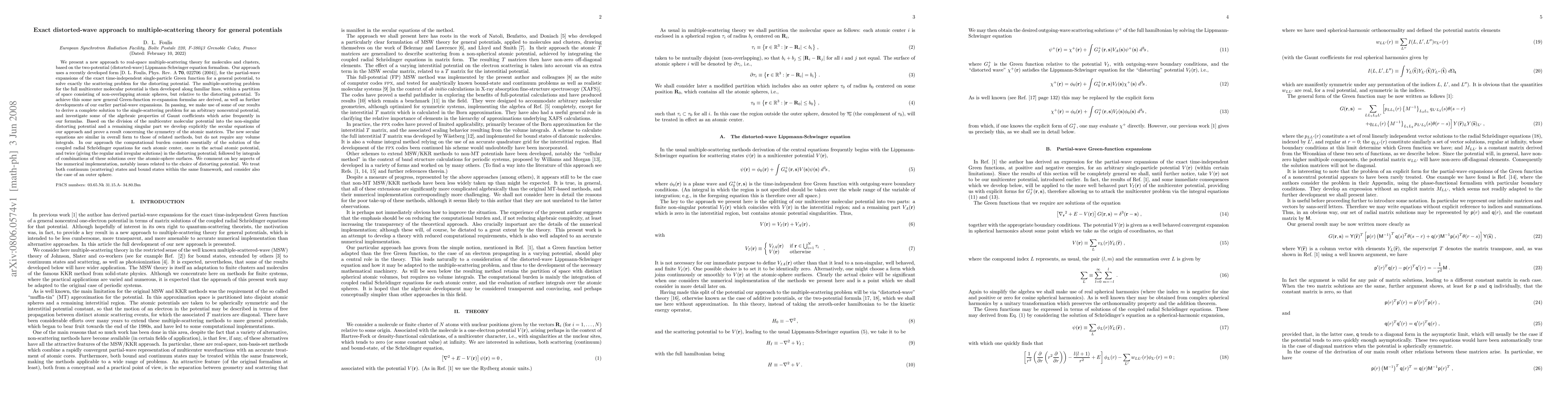 This paper introduces a new exact distorted-wave approach to multiple-scattering theory for molecules and clusters, utilizing a two-potential Lippmann-Schwinger equation. The method solves scattering problems using partial-wave expansions and re-expansion formulas for the exact Green function, treating both scattering and bound states without requiring volume integrals.