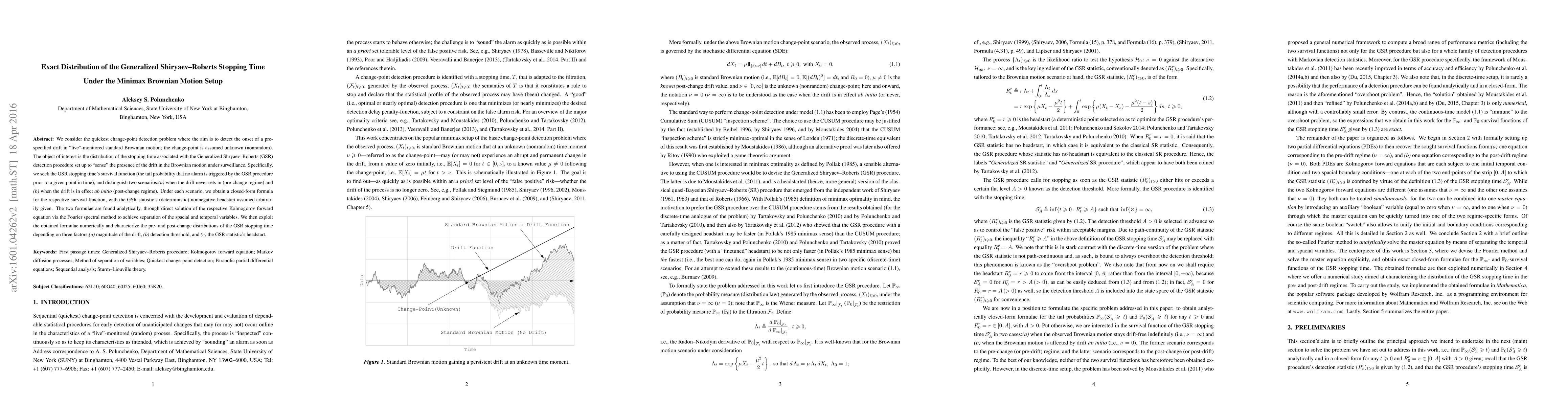We consider the quickest change-point detection problem where the aim is to detect the onset of a pre-specified drift in "live"-monitored standard Brownian motion; the change-point is assumed unknown (nonrandom). The object of interest is the distribution of the stopping time associated with the Generalized Shryaev-Roberts (GSR) detection procedure set up to "sense" the presence of the drift in the Brownian motion under surveillance. Specifically, we seek the GSR stopping time's survival function (the tail probability that no alarm is triggered by the GSR procedure prior to a given point in time), and distinguish two scenarios: (a) when the drift never sets in (pre-change regime) and (b) when the drift is in effect ab initio (post-change regime). Under each scenario, we obtain a closed-form formula for the respective survival function, with the GSR statistic's (deterministic) nonnegative headstart assumed arbitrarily given. The two formulae are found analytically, through direct solution of the respective Kolmogorov forward equation via the Fourier spectral method to achieve separation of the spacial and temporal variables. We then exploit the obtained formulae numerically and characterize the pre- and post-change distributions of the GSR stopping time depending on three factors: (a) magnitude of the drift, (b) detection threshold, and (c) the GSR statistic's headstart.