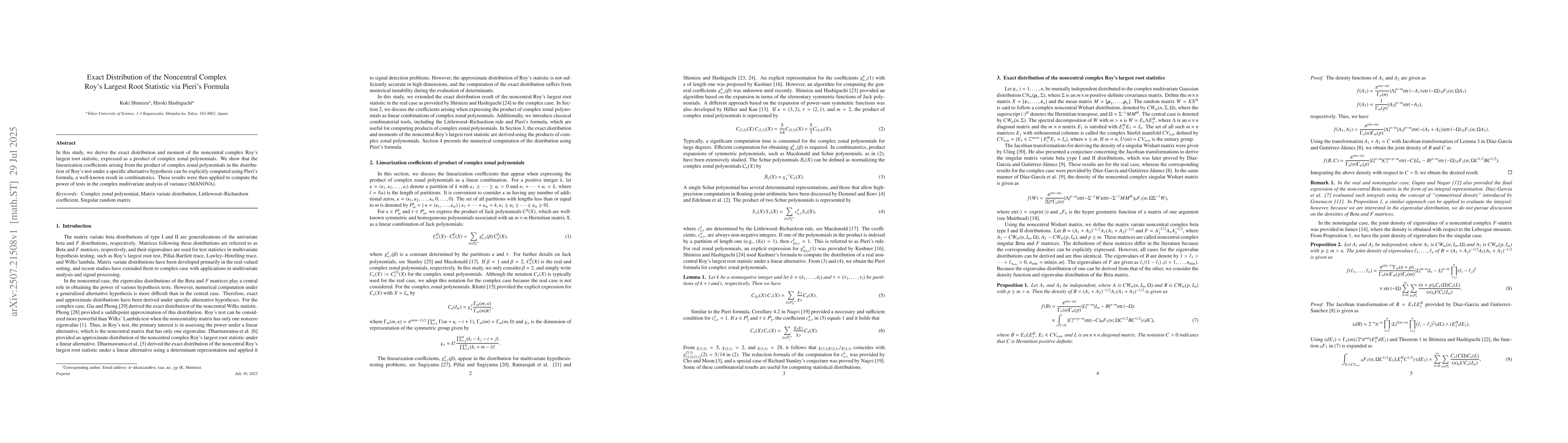 In this study, we derive the exact distribution and moment of the noncentral complex Roy's largest root statistic, expressed as a product of complex zonal polynomials. We show that the linearization coefficients arising from the product of complex zonal polynomials in the distribution of Roy's test under a specific alternative hypothesis can be explicitly computed using Pieri's formula, a well-known result in combinatorics. These results were then applied to compute the power of tests in the complex multivariate analysis of variance (MANOVA).