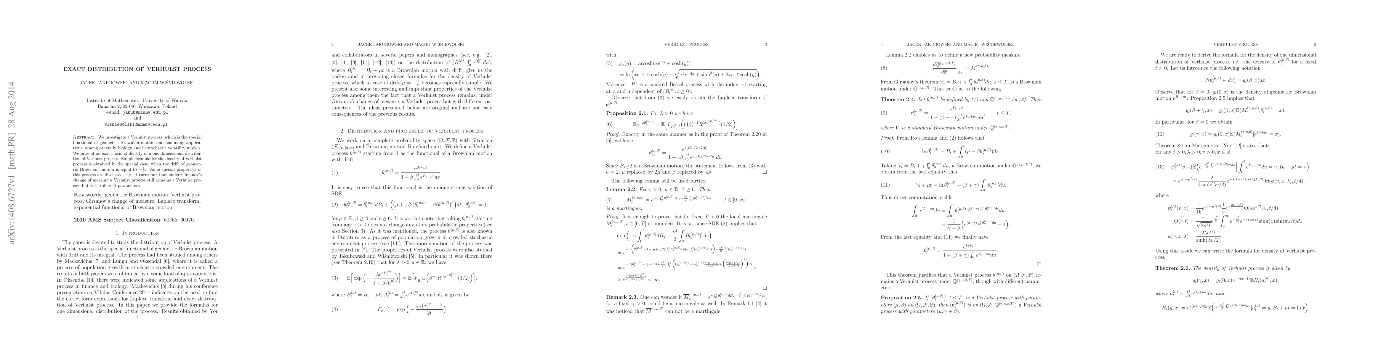 We investigate a Verhulst process, which is the special functional of geometric Brownian motion and has many applications, among others in biology and in stochastic volatility models. We present an exact form of density of a one dimensional distribution of Verhulst process. Simple formula for the density of Verhulst process is obtained in the special case, when the drift of geometric Brownian motion is equal to -1/2. Some special properties of this process are discussed, e.g. it turns out that under Girsanov's change of measure a Verhulst process still remains a Verhulst process but with different parameters.